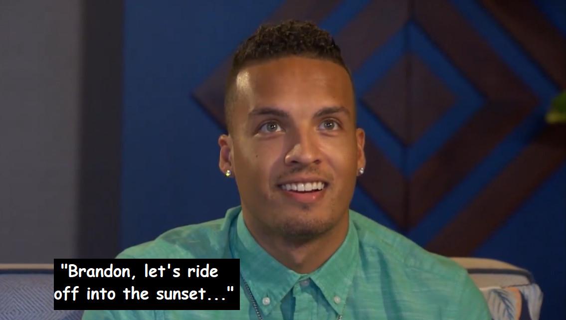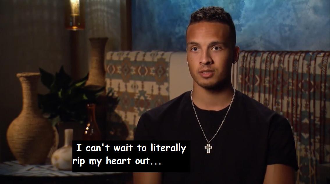 Before the nighttime portion of his date with Michelle, Brandon says, “I can’t wait to literally rip my heart out, throw it on the table, and just say, do what you want with it, because it only beats for you at this point.” He is like an insect without an exoskeleton—fully exposed to the harm we know this process will most likely wreak on him. And yet … Michelle seems to really like Brandon. She seems continually shocked by how much she really likes Brandon. And during the nighttime portion of the date, she tells him she doesn’t just like him, she’s falling in love with him. Of course, Brandon has already told her that he’s fully in love with her and ready to propose tomorrow. As previously mentioned, he was willing to “literally” put his heart on a dinner table—there’s really never been any question about the way Brandon feels.