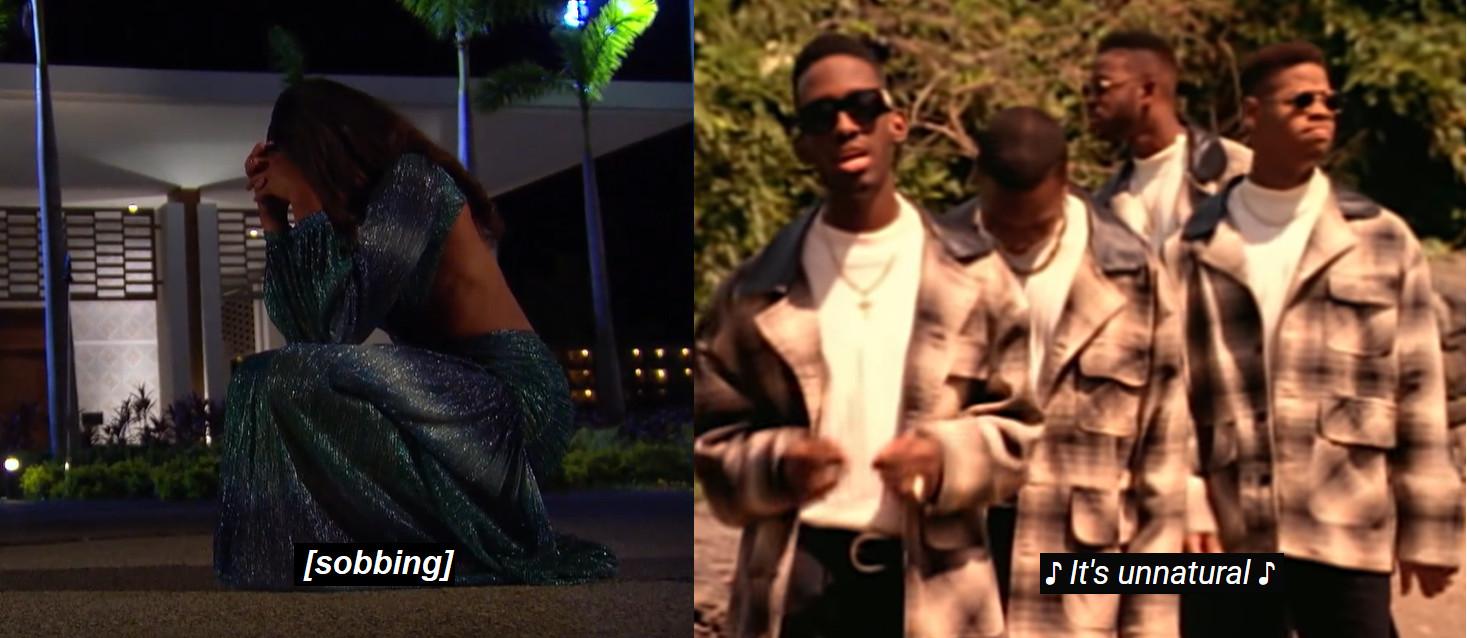 I’ll leave you with the hope that every single person in this final trio doesn’t wind up heartbroken—and since I skipped recapping two hours of yelling about pizza, one tweet-length review of last week’s Men Tell All: The world will not know peace until the entire airplane is made out of the black box material, and the entire Men Tell All special is made out of the blooper reel.