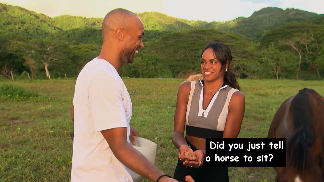 I can’t believe he’s making me say this about The Bachelorette, but Nayte seems like he’s not taking this seriously enough! He’s like the living embodiment of that Willow Smith song I keep hearing: Nayte caught a vibe, and he’s just riding it. And I guess that’s what he thinks Michelle is doing too …