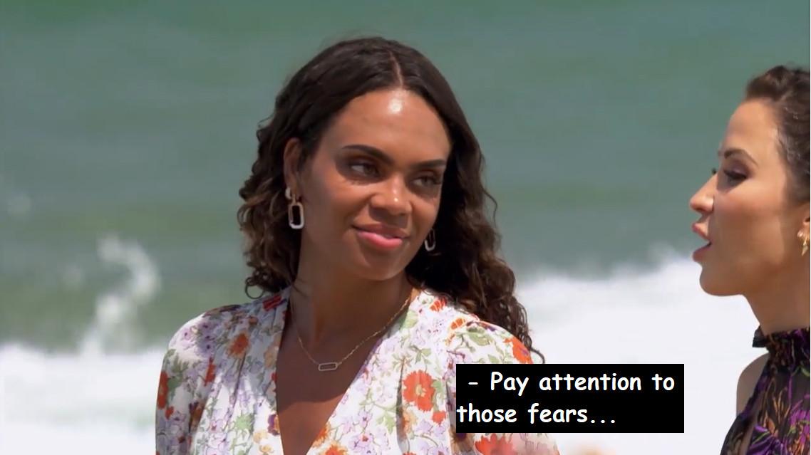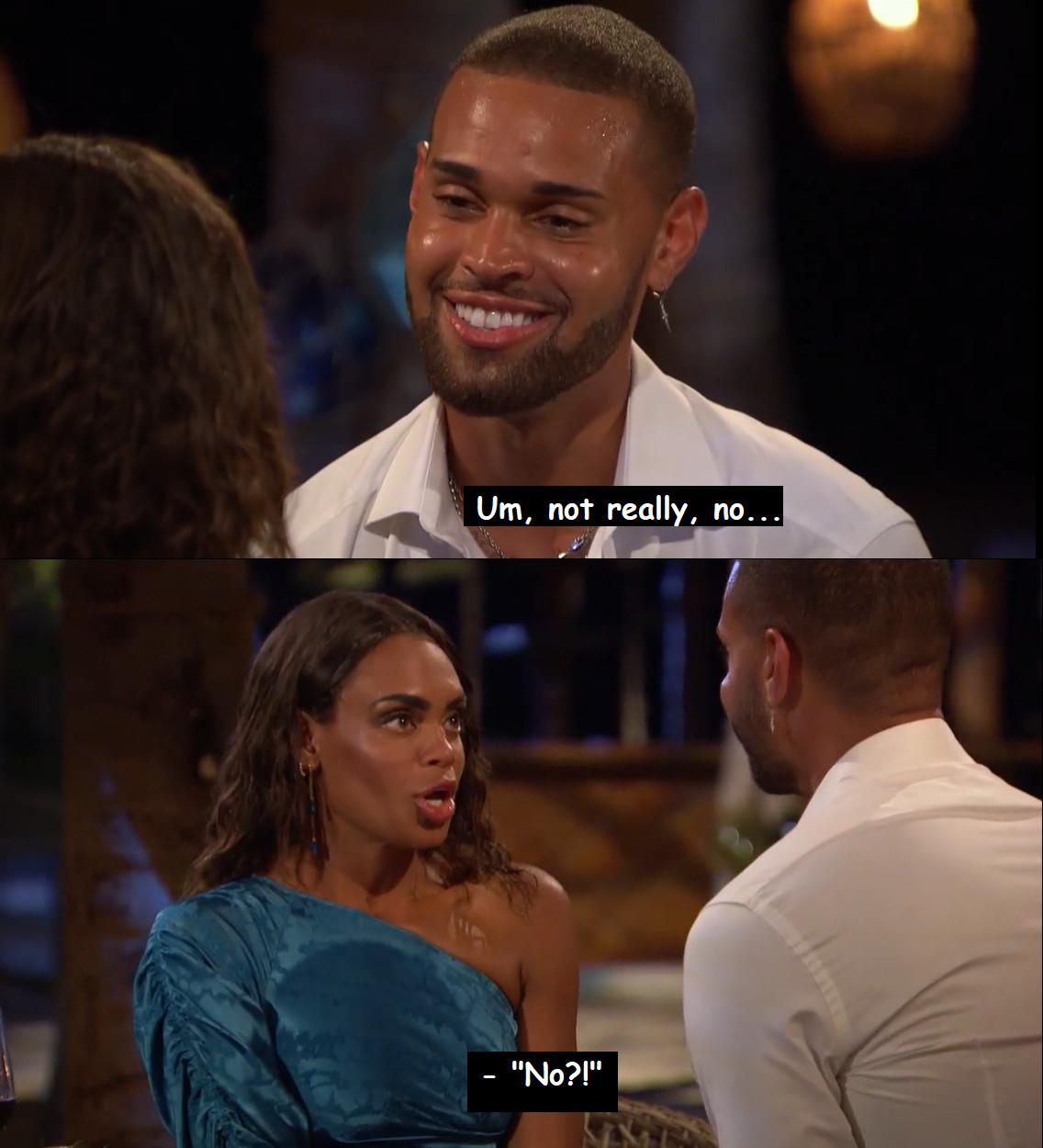 Does Nayte immediately revert back to saying he’s “falling in love” with Michelle in his testimonials? Sure. And when he sits back down with the other men, does he recap his time with Michelle thusly: