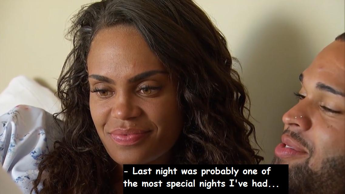 And again, when Nayte tells the woman who he’s claimed he can see himself proposing to in a week’s time that their first night alone together is “probably one of the most special nights” he’s ever had, perhaps it is me who is picking up on all the wrong words, and Michelle who’s choosing to hear all the right ones. Because at least when Nayte finally tells Michelle he’s in love with her—and Michelle says it back to him—there’s no misinterpreting that.