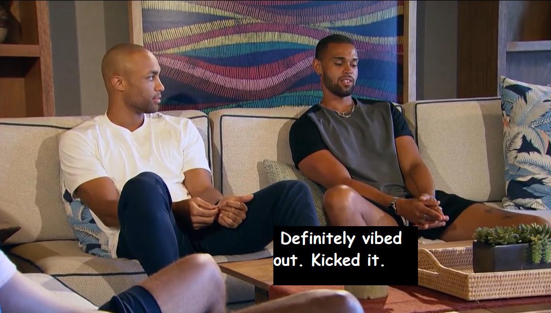 Should we abolish this mandatory gathering of the boyfriends pre-, mid-, and post-conjugal visit? Probably. It is the unproductive, unkind, and intentional psychological torture of three men who have already been asked to write spoken word poetry, beat each other with giant teddy bears, and stand in the same frame as Glen Powell and Jay Ellis on national television. Alas, it is also funny! And it gives us one of my favorite conversations of this entire season so far, when Nayte and Brandon—serving all the energy of two kid brothers play-wrestling until one kid brother winds up sobbing with a bloody lip while the other screams that he didn’t do anything—start saying the quiet part out loud. Nayte and Brandon actually start discussing that age-old question: Which placement in the three-part Fantasy Suite lineup is the best?