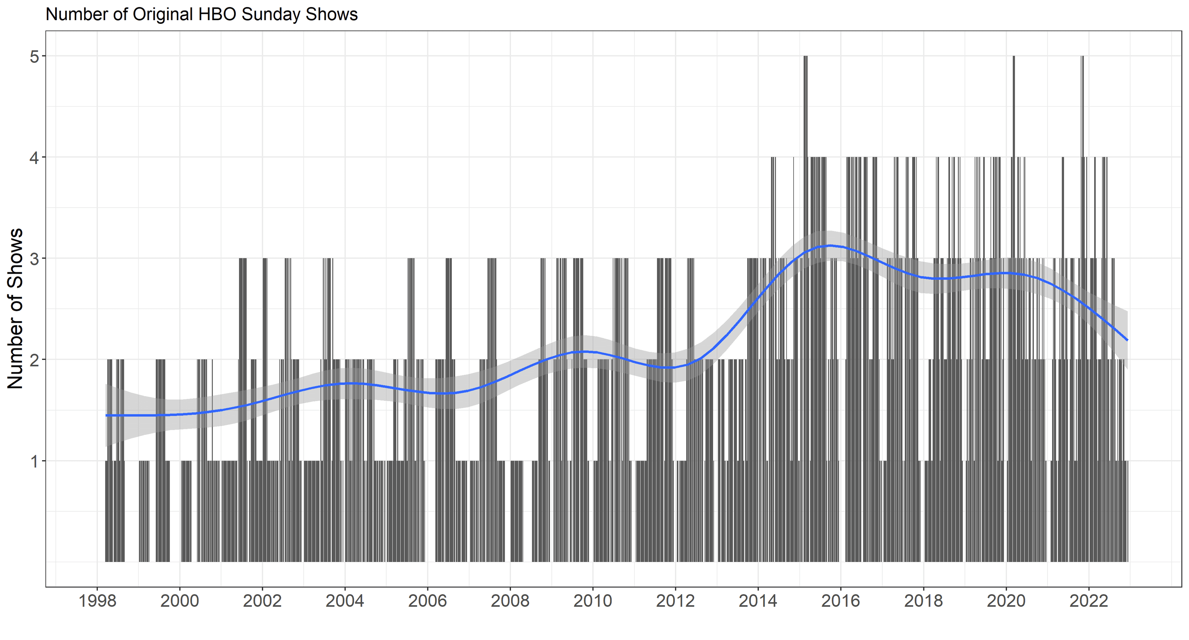 One immediate takeaway from studying the Sunday series data is that HBO’s Sunday original lineups have gotten much more crowded. For the first few years, one or two originals per Sunday was the standard. Then three become common, followed by four, with occasional spikes to five, as evidenced by the following graphs of the number of Sunday shows and the cumulative Sunday series and episode ratings over time.