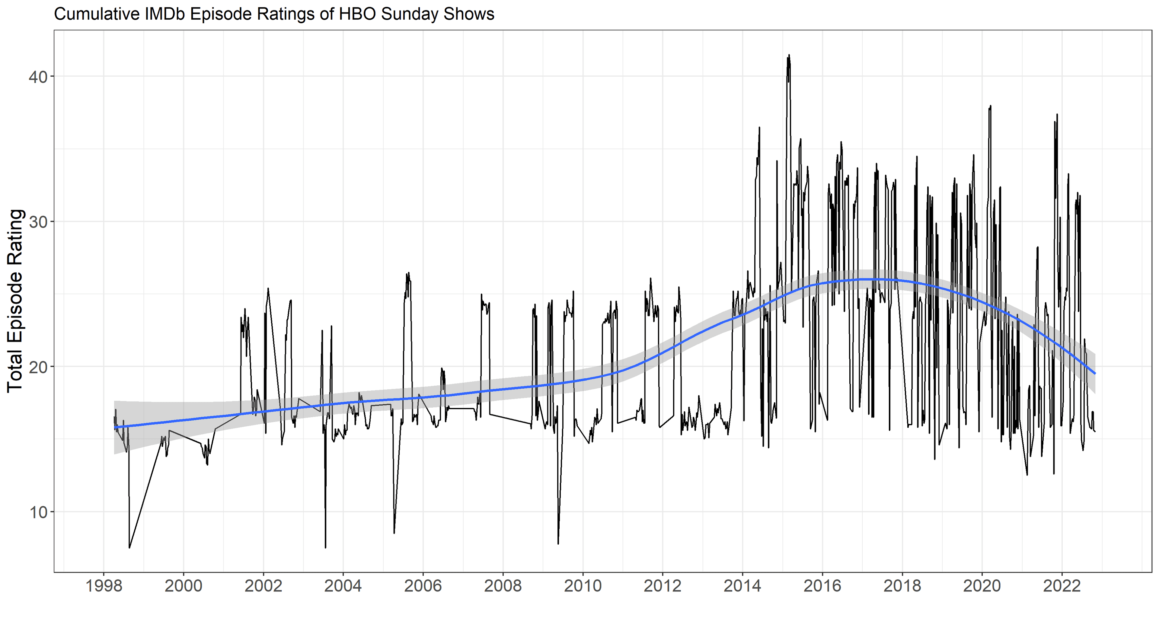 Naturally, HBO’s most exquisite Sunday is a matter of personal taste; your Sunday preferences depend on your series preferences. But we can get a feel for the consensus based on aggregations of many people’s personal tastes: IMDb user ratings. Using IMDb ratings of original, HBO-produced series that aired on Sundays in the United States, we can track the evolution of the lineups over time and measure the caliber of each Sunday’s offerings in various ways: at the series or the individual-episode levels, and based on average or cumulative quality. If Sunday is HBO, then this assessment of Sundays will give us a method of determining when HBO was at its best.
