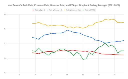 About 15 games ago, Burrow just stopped taking sacks. He went from regularly having sack weeks between 5 and 10 percent, with peaks above 10 and even 15 percent, to hardly having any peak weeks at all, and keeping his average week at or below 5 percent. This is particularly astonishing when you compare his rolling sack rate to his rolling pressure rate. Burrow’s pressure rate went down over time, as his line improved and he began intentionally avoiding sacks—but as his pressure rate has risen recently, given the improved quality of opponents and the injuries of his offensive line, Burrow’s sack rate is remaining stable.