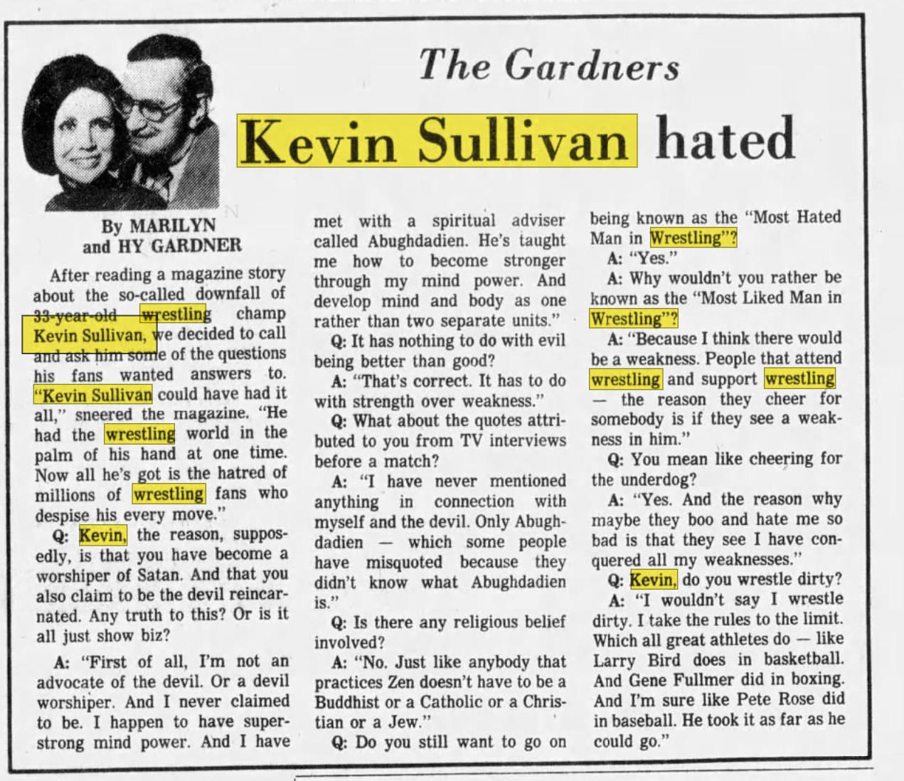 Sullivan’s creative process for his satanic gimmick evolved over time—but it was, he maintained in the autobiography, never explicitly ‘satanic’: “The funny thing was that I never used the word ‘Satan.’ People just took that on their own. I’d make reference to the Chairman of the Board and Abudadeen, but that name was based on a Hindu fertility god I heard about during a trip to Malaysia.” As he noted in an interview with syndicated columnists Marilyn and Hy Gardner, “I’m not an advocate of the devil,” only someone with “super-strong mind power.”