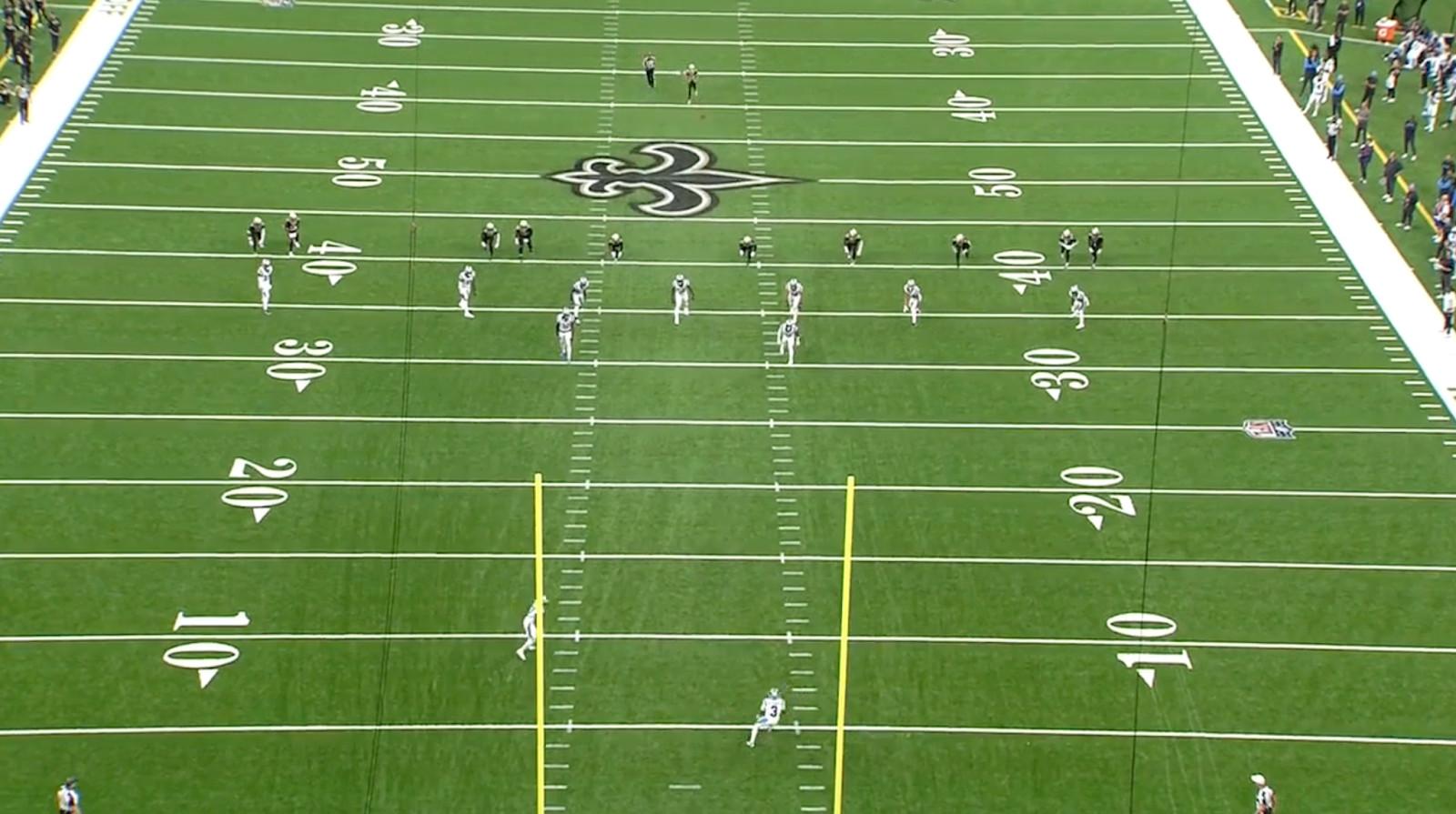 Thanks in large part to the Panthers defense’s complete inability to stop the Saints offense, allowing scores on New Orleans’s first 10 possessions, Grupe got plenty of work. His 10 kickoffs were the most of any kicker in Week 1. I watched each of Grupe’s kicks at least five times, and by my charting, every single one of his first nine kicks landed either at or inside of the 5-yard line, with a few of them landing almost exactly on the goal line. The Panthers returned only three of the six kickoffs to the 30-yard line or beyond; the average starting field position for the Panthers on returned kicks was the 27-yard line.