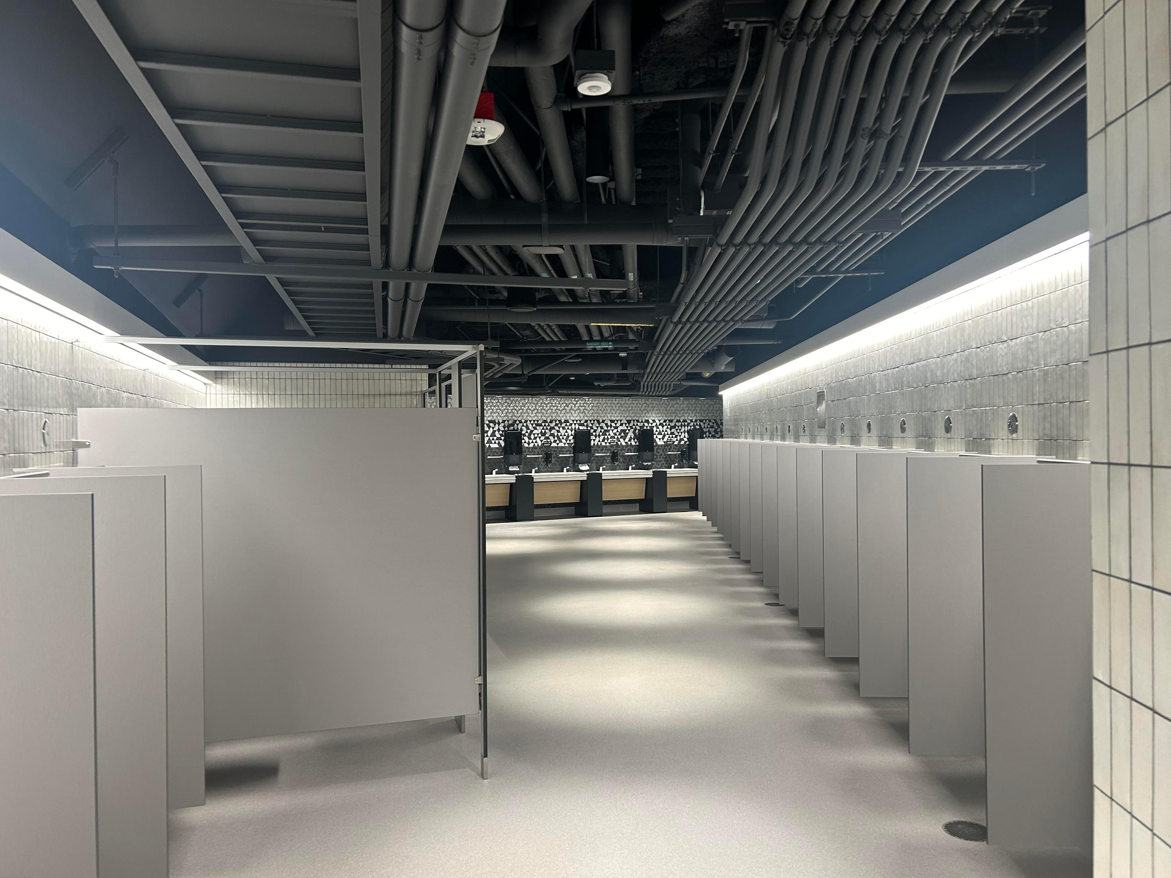 What I expected: mood lighting, dark wood trim, hardwood floors, screens in the stalls, in-game audio, futuristic country club commodes equal parts stylish and high-tech. Not bidets, but maybe seat warmers. The softest two-ply money can buy. Urinal cakes with Tim Cook’s face on them. Couches, candles, mints, that weird spray deodorant Arrid makes. Mouthwash and floss, Tylenol and BOSS. Some dude in a dress vest handing me paper towels with crests on them.
