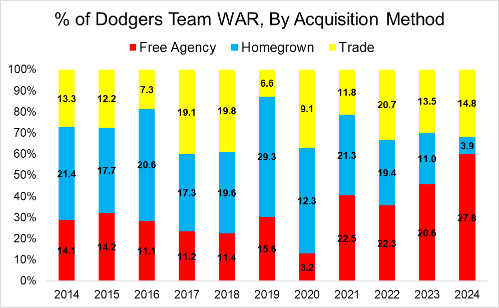 Check out the change in the relative heights of the blue (homegrown) and red (free agent) bars, in particular. Until recently, the Dodgers’ homegrown players usually outproduced their free agents or at least held their own. This year, they didn’t come close. The 2020 team (which was among the more homegrown-centric contenders that year) got way more WAR from homegrown guys in 60 games than this year’s group (the least homegrown team in the 2024 tournament) did in a full-length season. The only homegrown players who made contributions in Game 5 were Buehler (an impending free agent), Gavin Lux (the no. 9 hitter), and Will Smith (who signed a sizable extension of his own this spring). The Dodgers’ track record of adept drafting and development has helped them afford and seduce superstar talent—Juan Soto, Roki Sasaki, or Corbin Burnes could be next—but it’s no longer paying huge direct dividends.