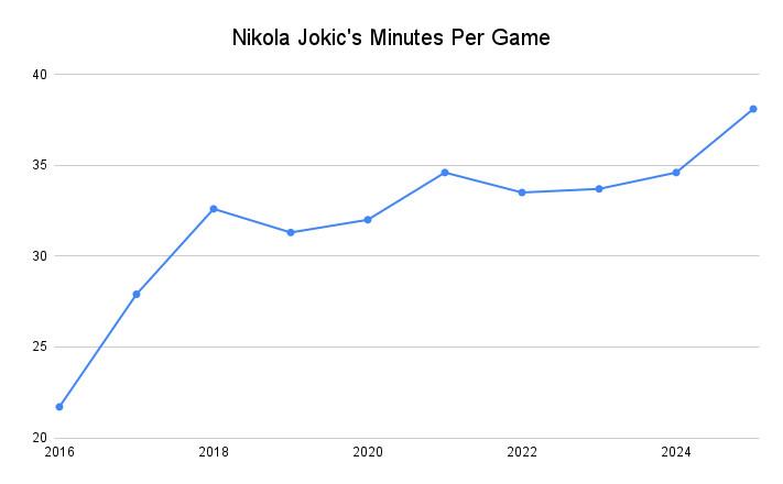 Jokic is averaging 38.2 minutes per game, which is the second-highest figure in any 10-game span of his regular-season career. Outside the playoffs, the only other stretch in which Jokic played more was the 10-game sprint to close the 2017-18 regular season, when Denver nearly surged into the playoffs but fell short in overtime against Minnesota in Game 82. Given that many of those games were de facto elimination contests, the start to the 2024-25 season represents the most Jokic has ever played in a “normal” period.