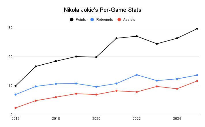 So it’s really saying something that Jokic’s start to the 2024-25 season represents the best stretch of his regular-season career. Don’t just take my word for it; the numbers say so. According to game score—an all-in-one metric designed to capture a player’s overall production—Jokic is somehow one-upping himself. The following chart shows the best non-overlapping 10-game stretches of Jokic’s career; his start to this season ranks second, behind only a 10-game span—from Game 4 of the first round through Game 2 of the conference finals—during his run to a championship in the 2022-23 postseason.