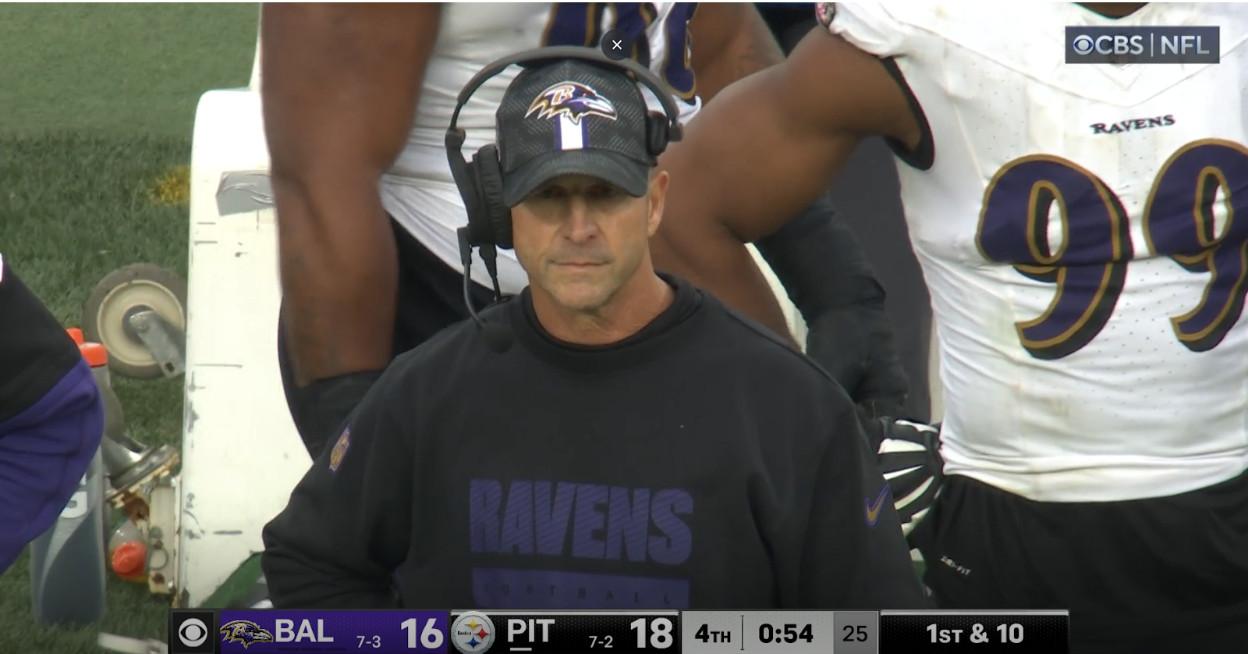 There is no life behind Harbaugh’s eyes. His tolerance for painful, inexplicable losses has been built up over years of games that have played out exactly like Sunday’s loss to the Steelers. There were missed field goals by Justin Tucker (whose days as a great kicker appear to be over), drops by the receivers, missed throws by Lamar Jackson, fumbles, too many penalties, and a ridiculously unfortunate interception. We were a poorly timed Mark Andrews drop on third down away from hitting weird Ravens loss bingo.