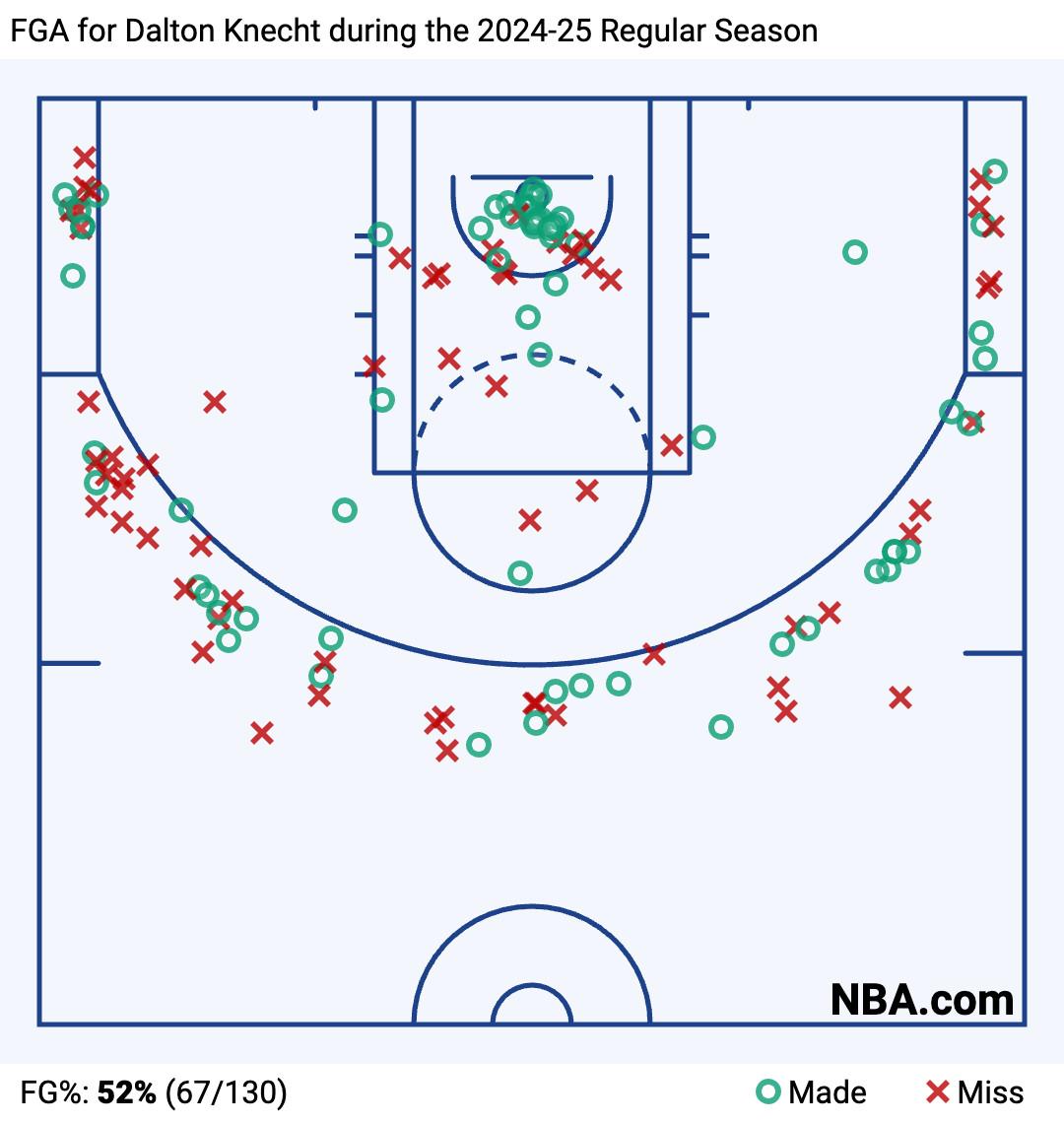 While Knecht can score, opposing teams will attack him mercilessly on the other end until he proves he can stop them. He’s displayed minimal ability to do so thus far. Out of 236 players with at least 250 minutes played this season, Knecht ranks 233rd in stocks (steals plus blocks) per 36 minutes.