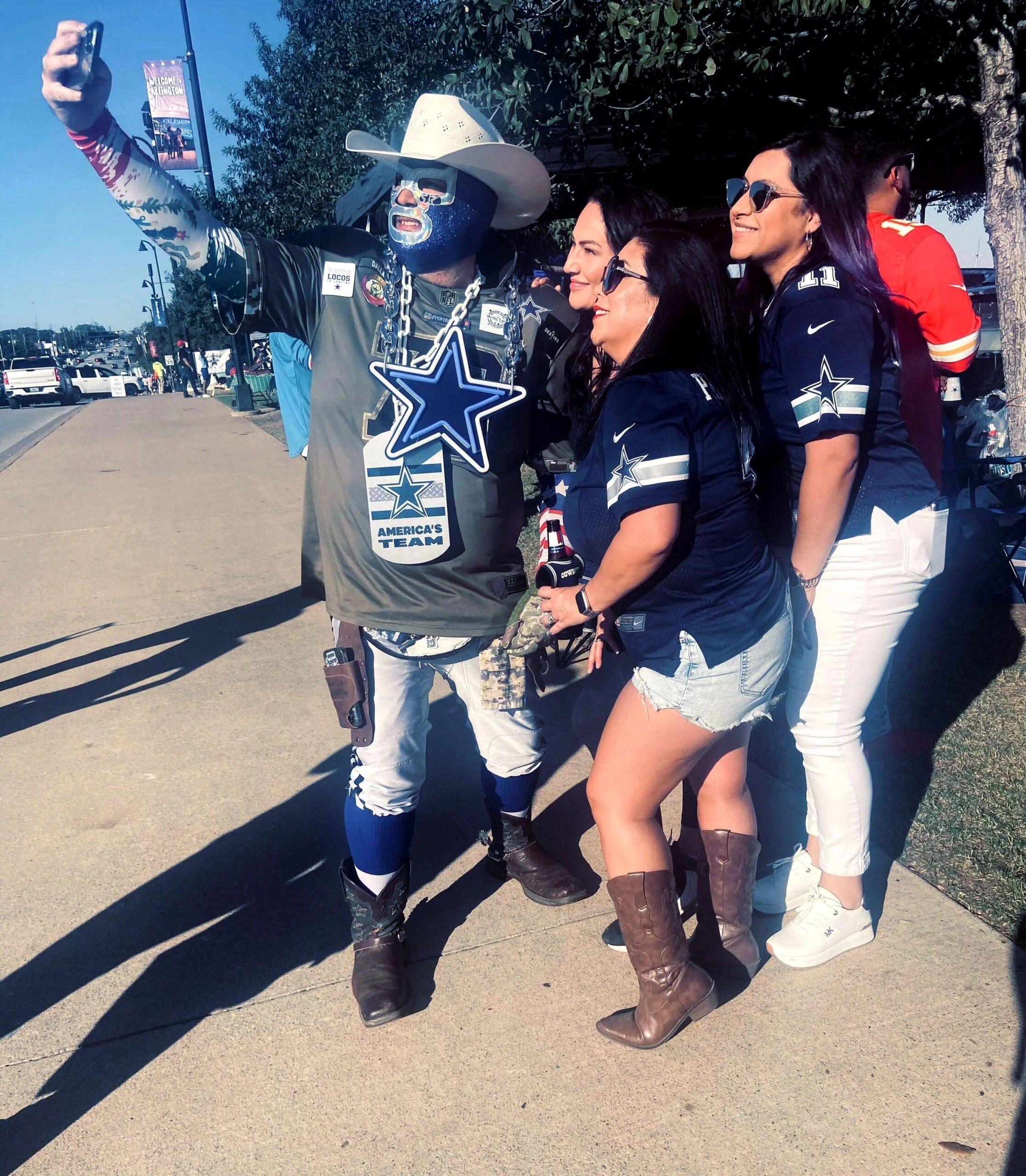 I first reached out to him seeking to put a face (or mask) to late-stage Cowboys devotion, the most contentiously regarded rooting interest in the U.S. sporting landscape. Over the course of an afternoon, I watched as Miguel posed for countless selfies inside and outside AT&T Stadium, handing out stickers to any little kids startled by the outfit. It was never clear how many folks knew him personally and how many just vibed with the getup.