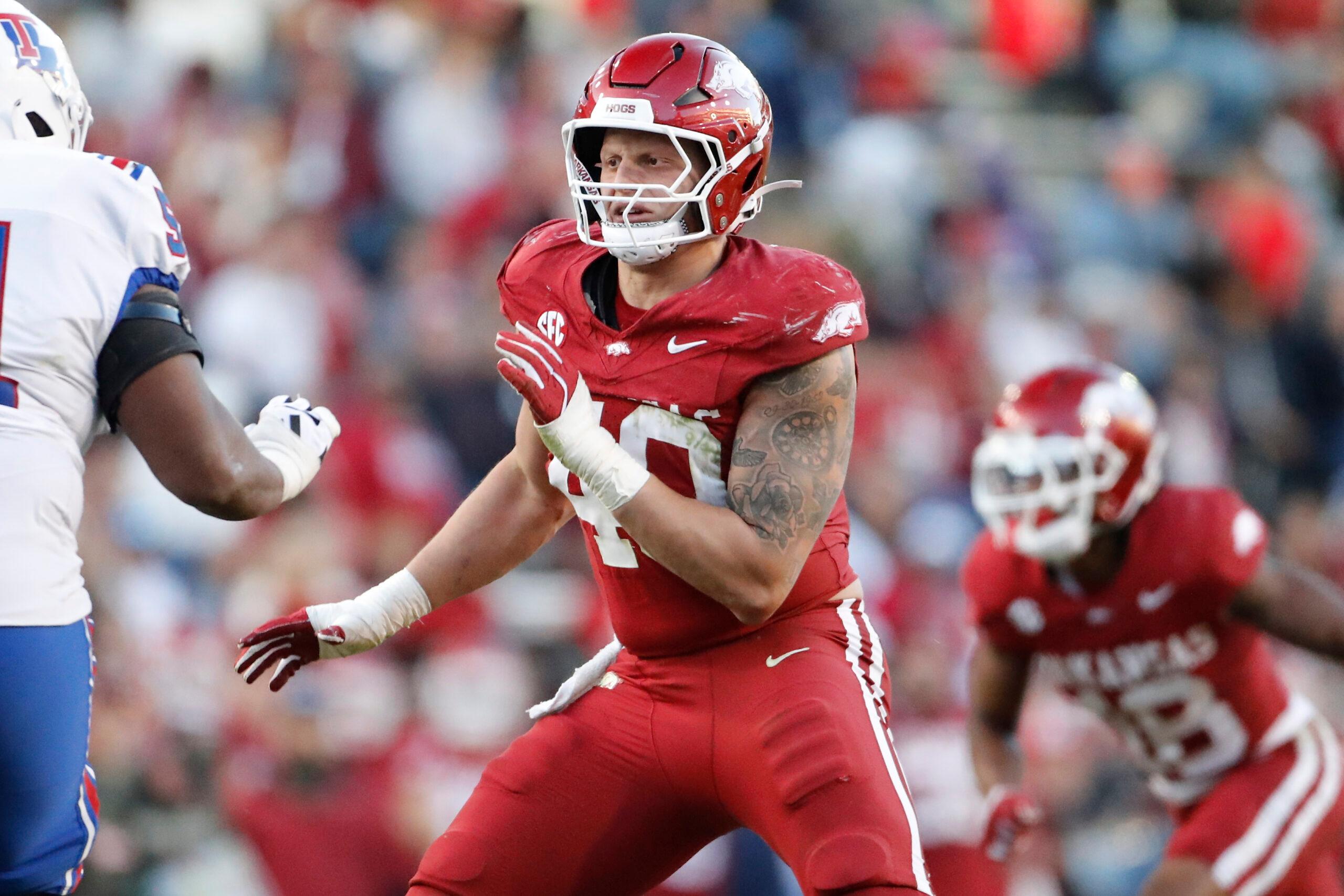 The Lions could add some more talent to their defensive line by selecting Jackson, who offers immense length at a listed 6-foot-7 and 280 pounds. The Razorbacks standout plays with tenacity and a high motor on the edge and uses his long arms to control opponents while swiping, ripping, and dipping to get under and around blocks. This style of play would be a nice fit in Dan Campbell’s defense.