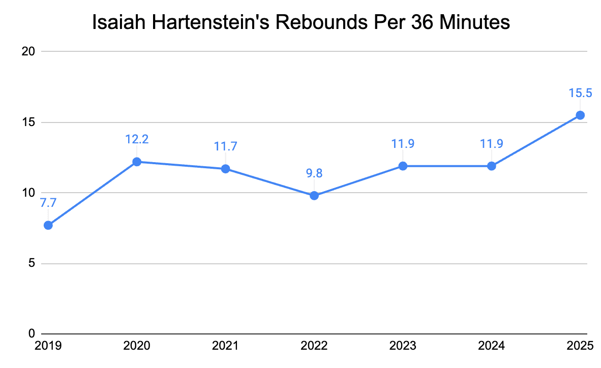 In other words, Hartenstein would be a valuable addition even if he weren’t an elite defender—but that’s his biggest strength! Leading advanced stats EPM and DARKO rank Hartenstein among the five best defenders in the game, and his teams have been stingier defensively with him on the court in every season of his career, per CtG.