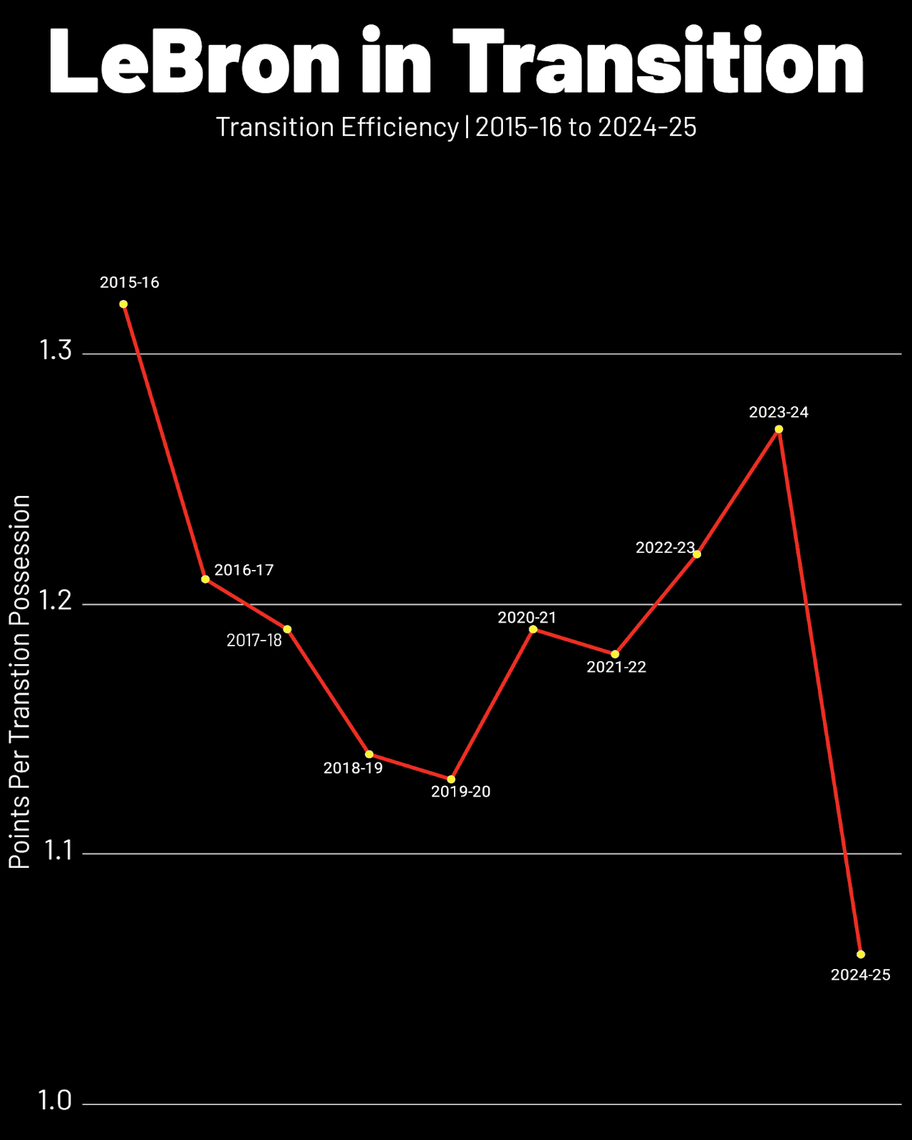 In his prime, James was simply the best fast-break threat in the NBA. In 2015-16, the first year the league tracked transition efficiency, James ranked sixth in transition opportunities, but his 1.32 points per possession ranked tied for first among the league’s top 25 most active transition players, outpacing other superstars like James Harden, Stephen Curry, and Antetokounmpo. James in the open floor was offensive efficiency in a can.
