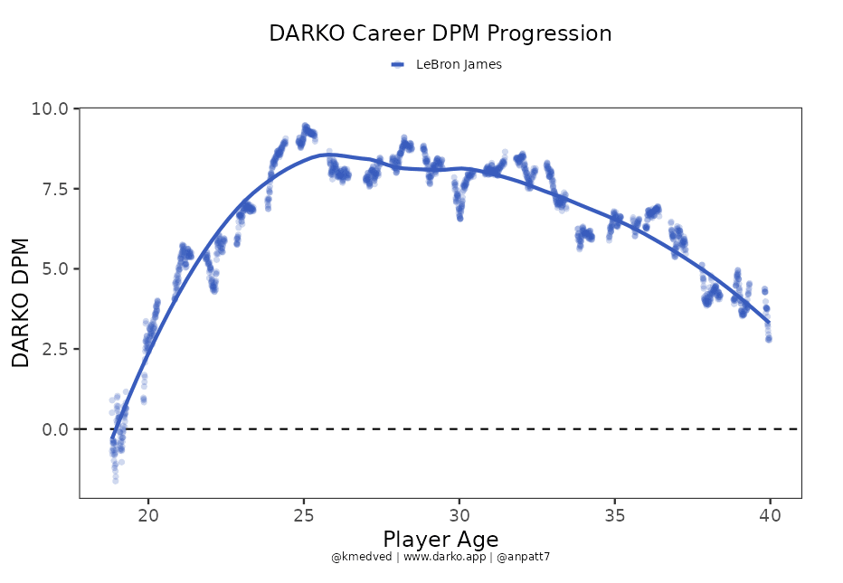 Through the lens of the DARKO career model, a phenomenal nerd-resource created by Kostya Medvedovsky, James’s aging curve crested as he approached 30, and 10 years later his impact scores mirror those of early 20s, long before he became an NBA champion.