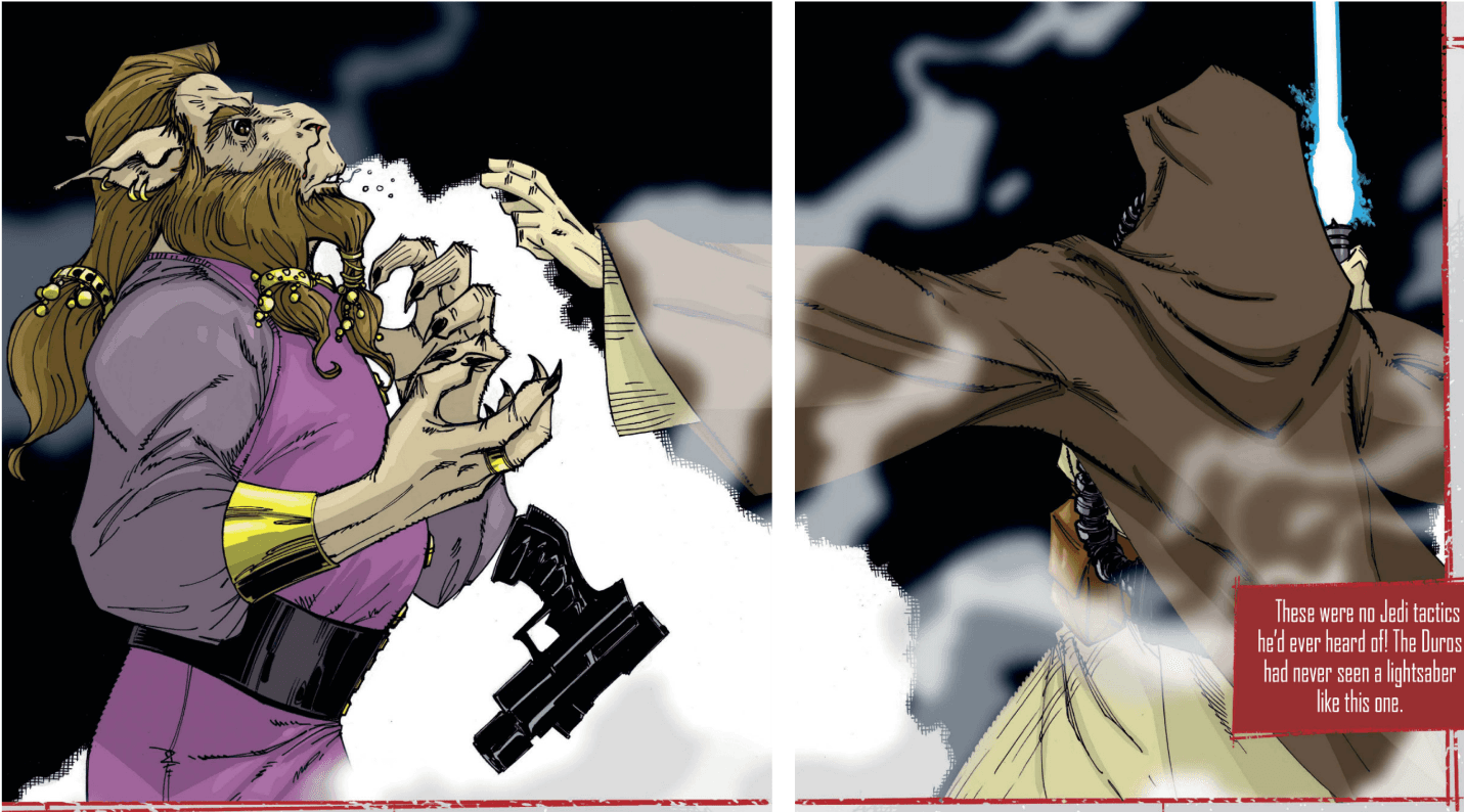 The last Legends instance I’ll cite comes from “Reputation,” a 2012 short (origin) story published in the magazine Star Wars Insider just before Disney purchased the Star Wars franchise. It’s about bounty hunter Cad Bane, who first appeared in The Clone Wars and later leaped to live action in The Book of Boba Fett. “Reputation” finds a young Bane working for a crime boss who’s been harried by a Jedi. He uses a thermal detonator and carries a lightsaber that looks more like a spear. And as for his Force jump: “For just a split second, as the Jedi crouched, the bounty hunter swore he spotted tiny flashes of light from the soles of the man’s boots.”