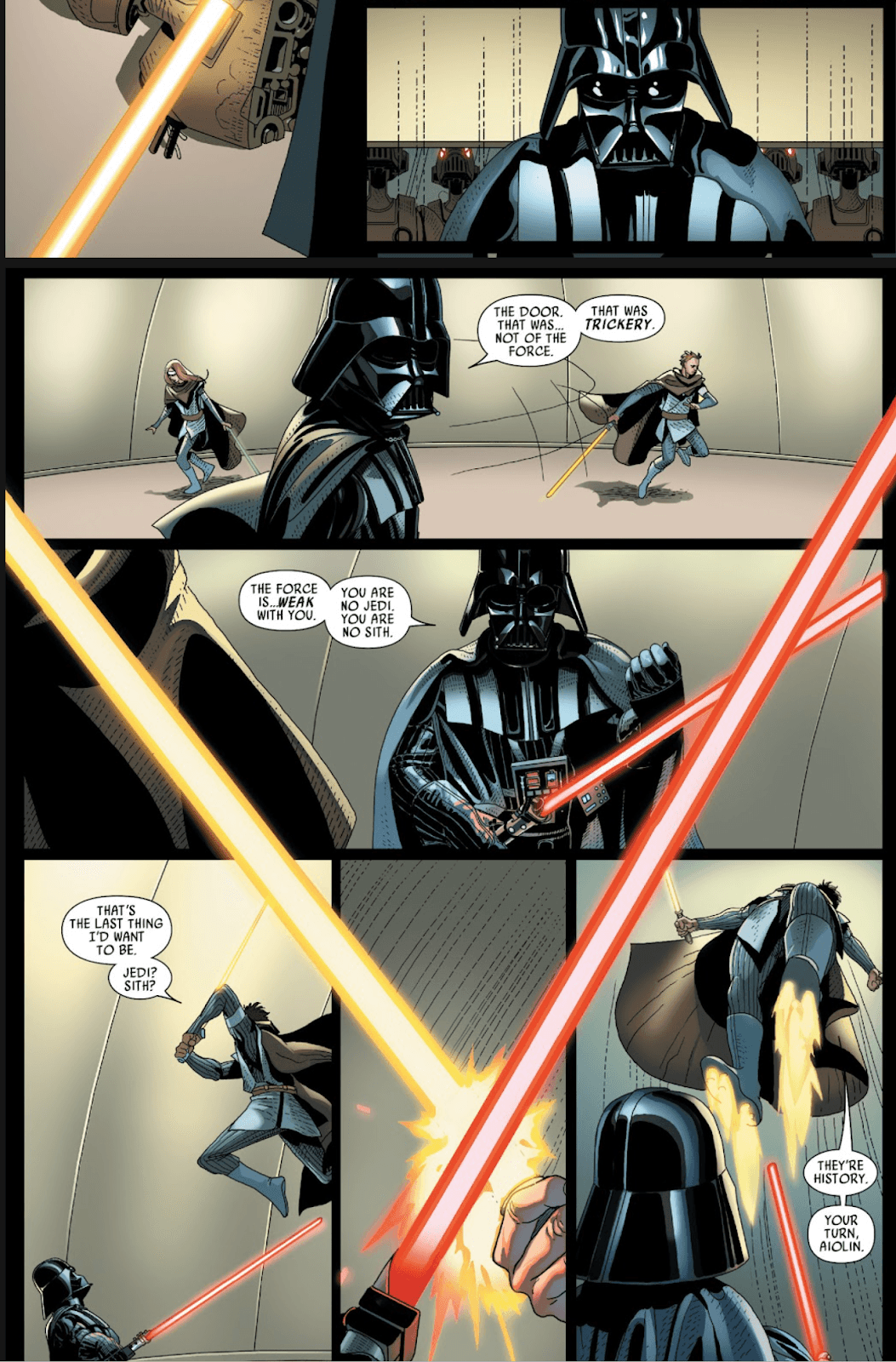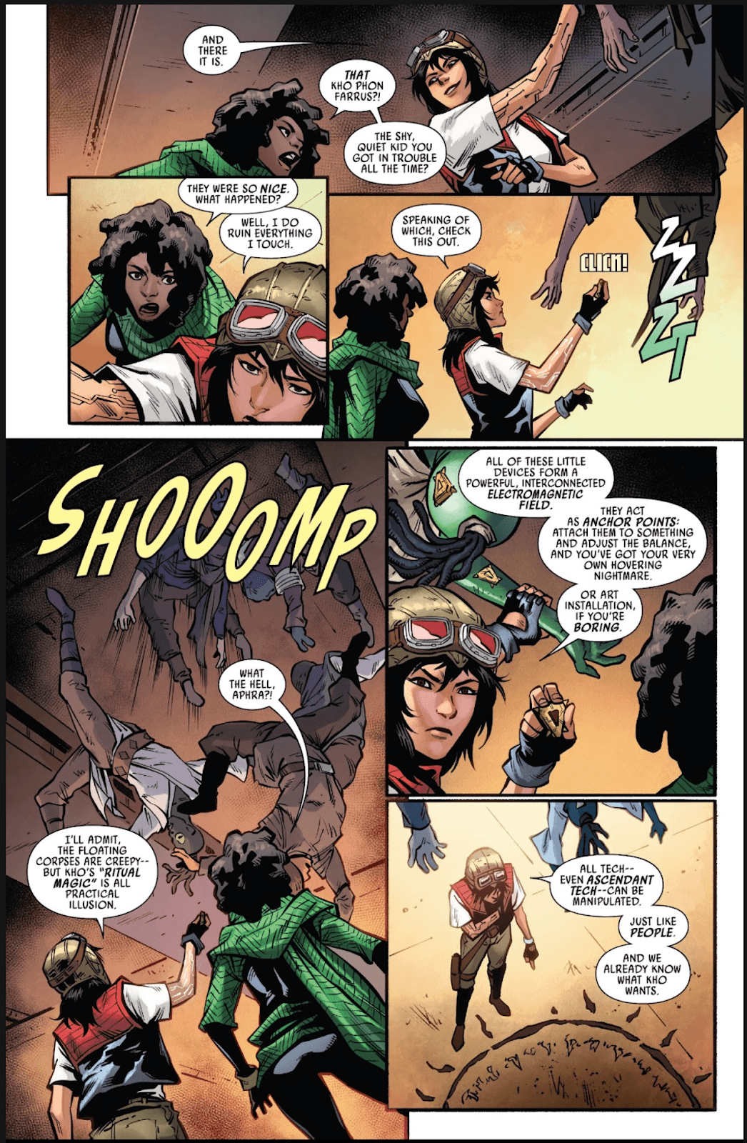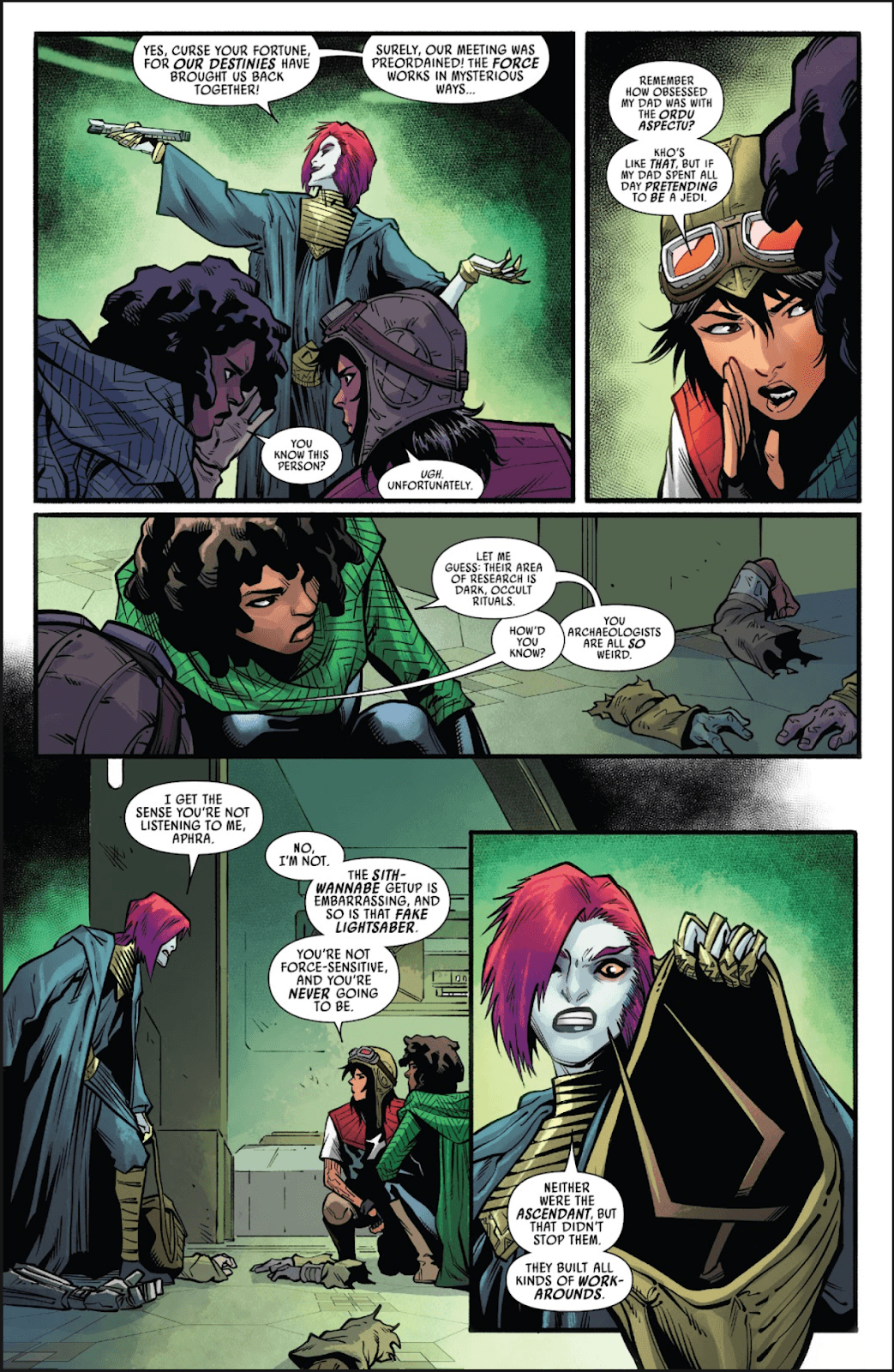 Years later, in an early 2022 arc of comic Doctor Aphra, the popular eponymous protagonist (who debuted in that 2015 Darth Vader run) tangles with a dark-side wannabe named Kho Phon Farrus, who uses electromagnet fields and ancient artifacts to simulate Force sensitivity.