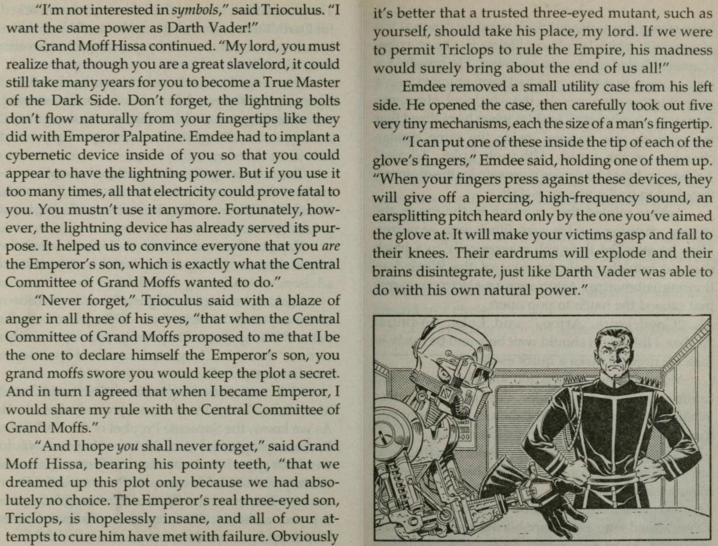 The practice of pretending to wield the Force is far from an Obi-Wan-oriented phenomenon. The Disney-decanonized Legends corpus is replete with examples of Force phonies—my personal favorite (in a so-goofy-it’s good sort of way) being the tale of Trioculus, a character who appeared in the Jedi Prince series of junior novels published in 1992 and 1993. Trioculus—not to be confused with Triclops, who appears in the same series—is the self-proclaimed son of Emperor Palpatine. A mutant who has a third eye on his forehead (in case you hadn’t guessed) and rules as the “supreme slavelord” of the spice mines of Kessel, he’s installed by the Grand Moffs as the new Emperor after Palpatine meets his end. Although he has no Force sensitivity, cybernetic implants in his fingertips allow him to project convincing-looking (and -feeling) “Force” lightning, which helps him command the Moffs’ respect and consolidate control. Few others know that his abilities come more from machine than man.