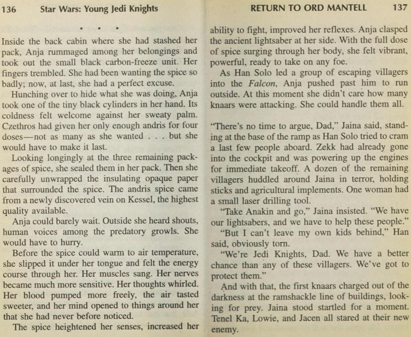 Another ’90s character related to this lineage of Force fabulists is Anja Gallandro, who appeared in the last three entries in the 14-book Young Jedi Knights series of young-adult novels. Gallandro, who lacked any aptitude for touching the Force, used and abused spice that heightened her senses and reflexes and helped her fight like a Jedi (lightsaber and all).