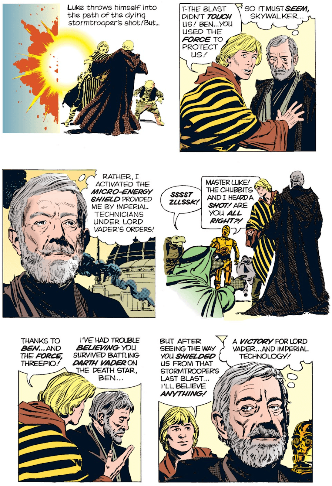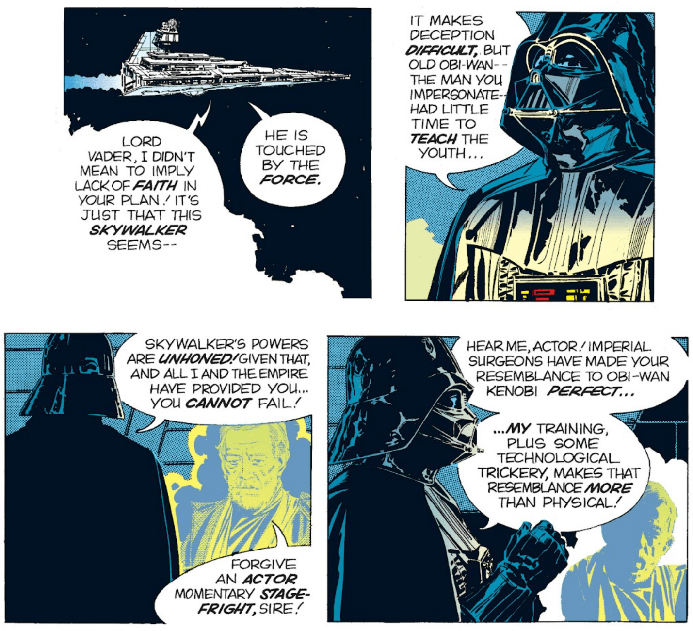 The history of Force frauds date back to at least 1982, when the Star Wars comic strip written by Archie Goodwin and drawn by Al Williamson introduced an Obi-Wan impostor in an arc entitled “The Return of Ben Kenobi.” In this story set between the first two films of the original trilogy, Darth Vader hires an actor to impersonate Obi-Wan Kenobi in order to lure Luke Skywalker into a trap. The actor undergoes facial surgery to look exactly like the deceased Jedi master, and that superficial Kenobi-ness, in tandem with “concealed circuitry that enables [him] to simulate aspects of the Force,” ensnares the young Rebel hero. (The first of these plot devices actually anticipates a plot line produced 30 years later in our galaxy, in which the real Obi-Wan transforms his face to resemble a bounty hunter’s in an effort to thwart a Sith lord’s plot on The Clone Wars.)