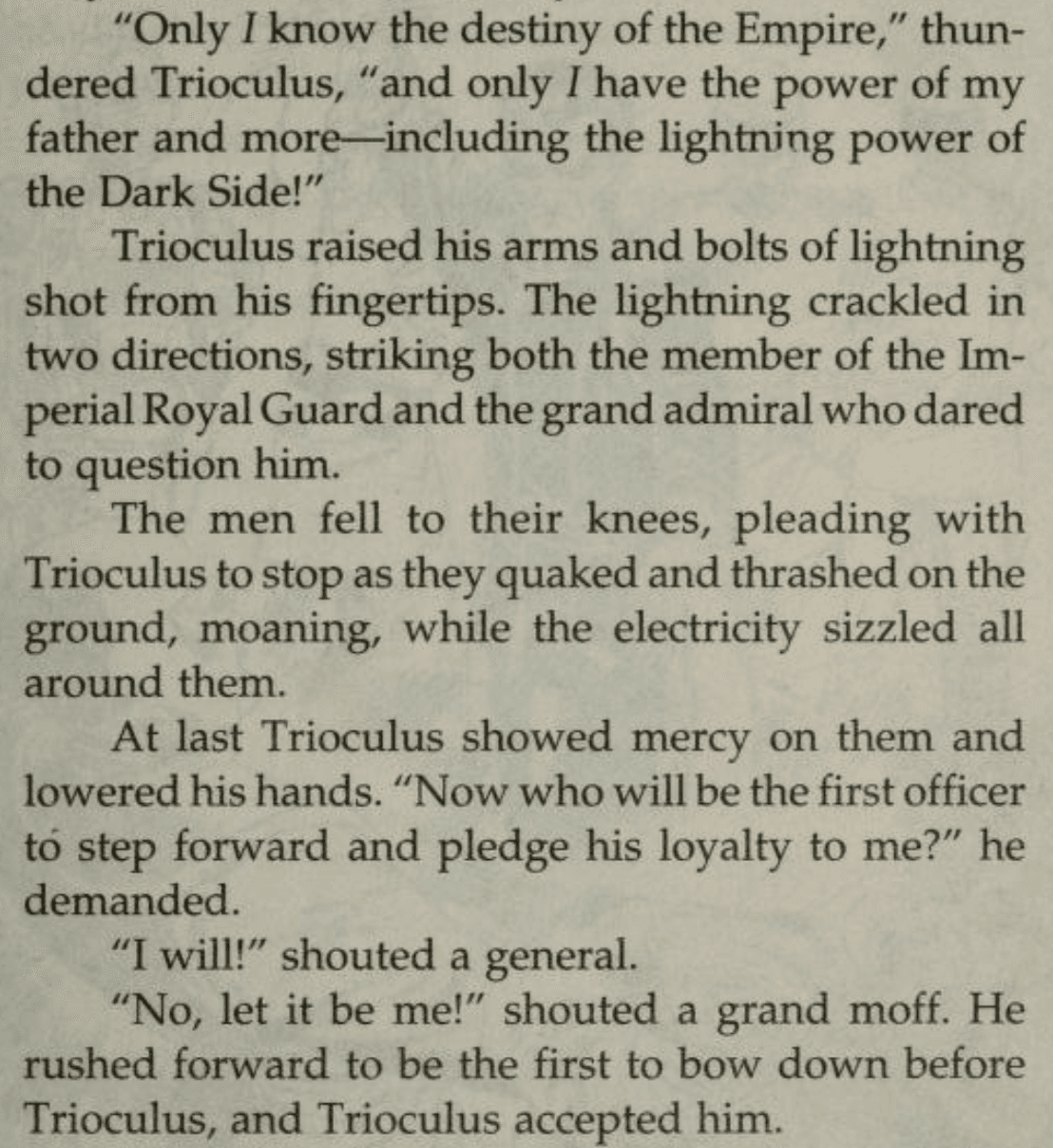 The Trioculus trope was repeated in the 1997 conclusion of the Junior Jedi Knights series of young reader novels, in which a character called Orloc (rhymes with warlock!) declared himself to be an “Emperor’s Mage,” a member of a group called the Prophets of the Dark Side. Orloc is a false prophet, but like Trioculus, a persuasive one. He’s a little lower-rent than Trioculus, though: Real, lethal lightning is beyond his budget. Orloc uses a spangled robe to control speakers, flickering lights, and sprinklers,and other equipment that produces a sound and light show and makes it look like Orloc can summon storms and lift heavy objects. He’s no match for real Force-sensitives, once they’re onto his act.