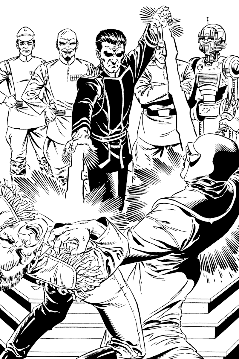 “The Force is obsolete,” Cylo (or, well, one of his clones) tells Vader. “These are its successors.” Predictably, the Emperor’s helmeted enforcer isn’t impressed by the technological terrors Cylo has constructed; he considers them heretical, blasphemous abominations. Cylo’s creations are formidable, but their “trickery” can’t compete with the power of the dark side.