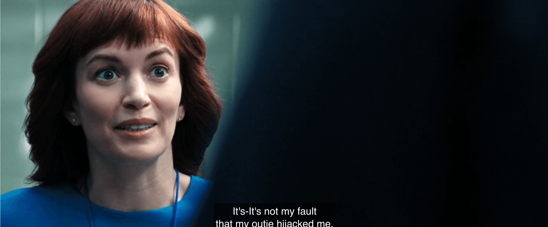 A few minutes later, when Helena gets in the elevator and is warped into Helly, her innie does in fact resemble an animal—all bulging neck tendons and shifty eyes and cornered rage. But can you blame her? As far as I can tell, this has been life from Helly’s perspective over the past … what, few hours?:
