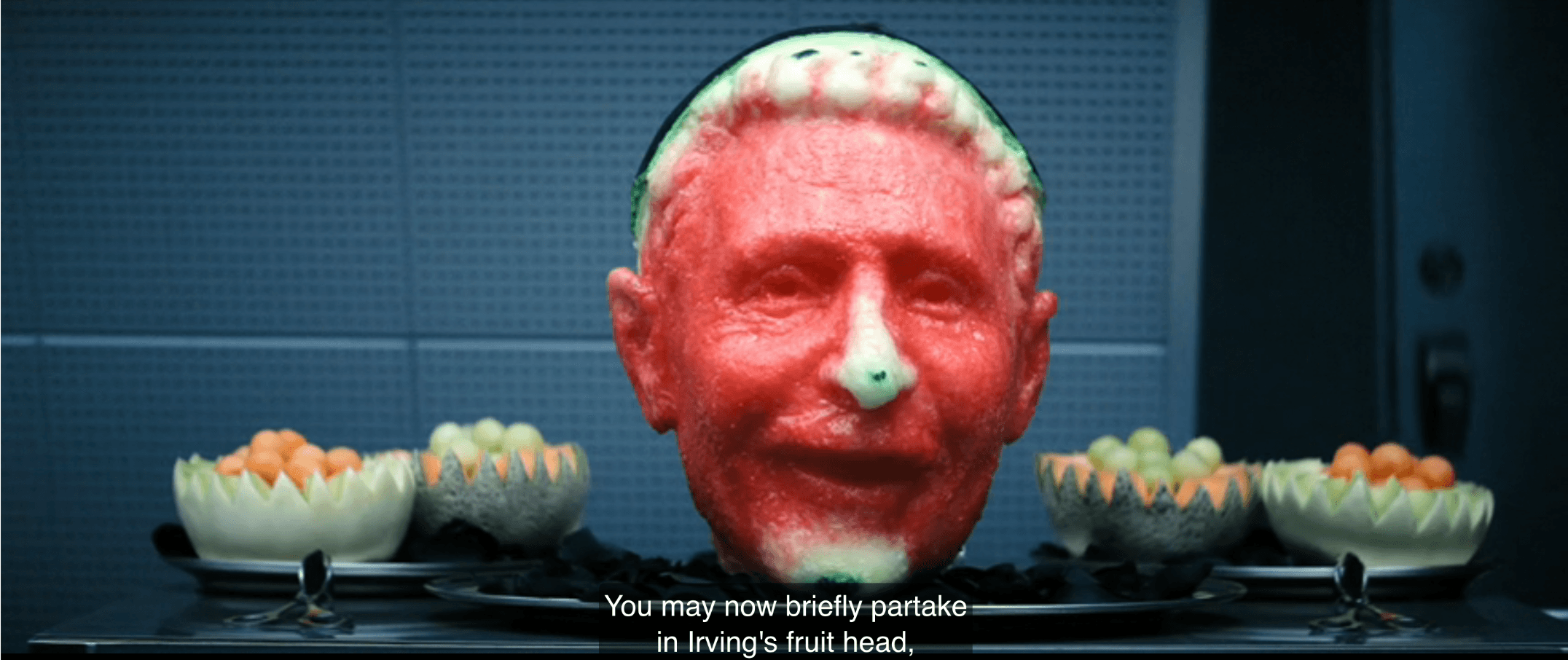 - The pronouncement “You may now briefly partake in Irving’s fruit head” as a watermelon carving of his likeness is served