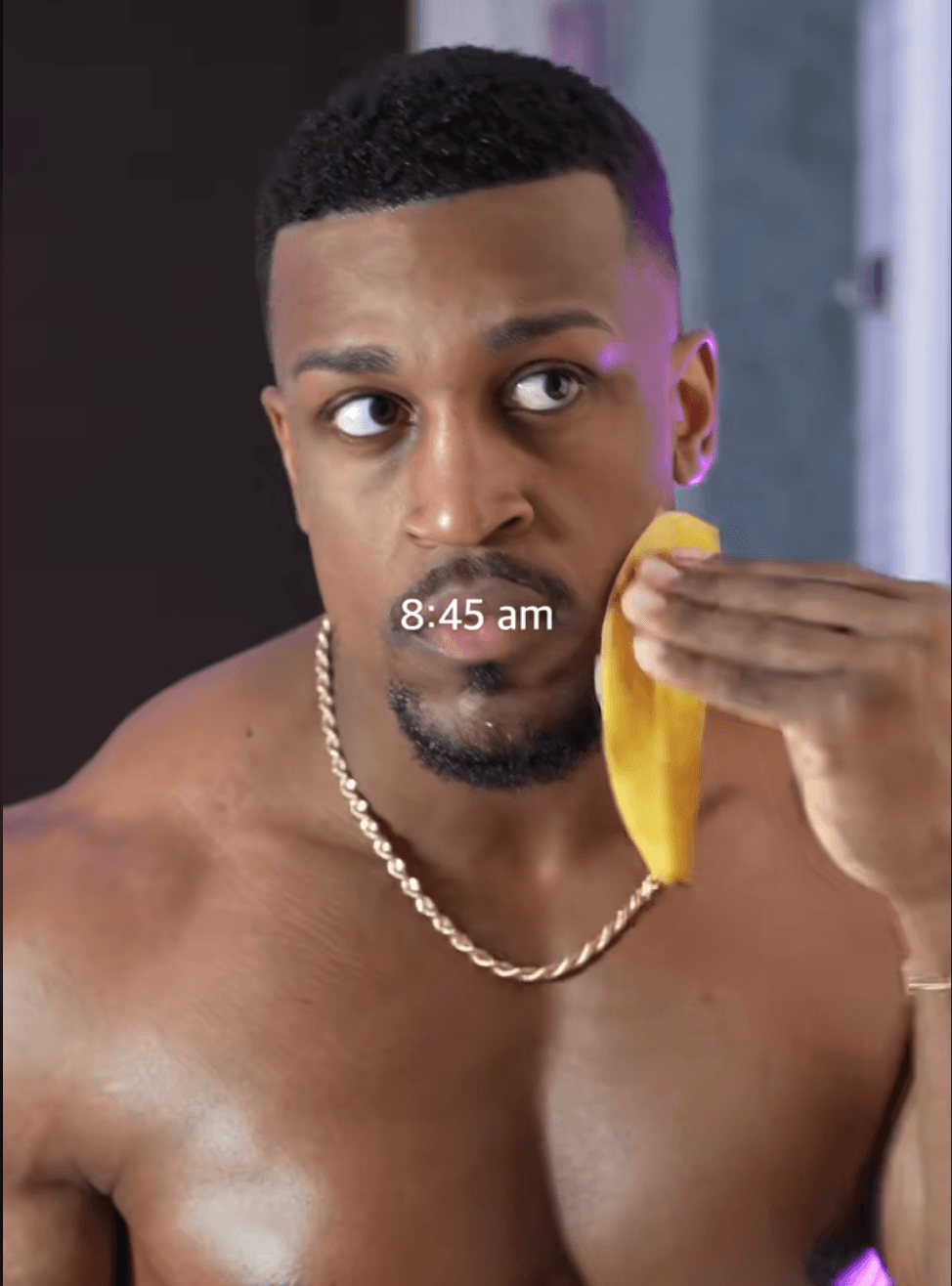 8:43-8:45 a.m.: Eat banana, rub banana peel on face