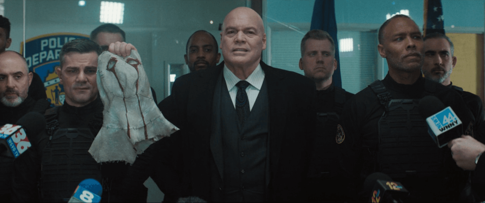 In the aftermath, the police finally reach Heather’s office to find Muse’s corpse and Heather unconscious but stabilized. Fisk later arrives at the crime scene and is told by Sergeant North that Daredevil beat them to the punch, but the mayor corrects him, intending to take full credit for Muse’s killing.