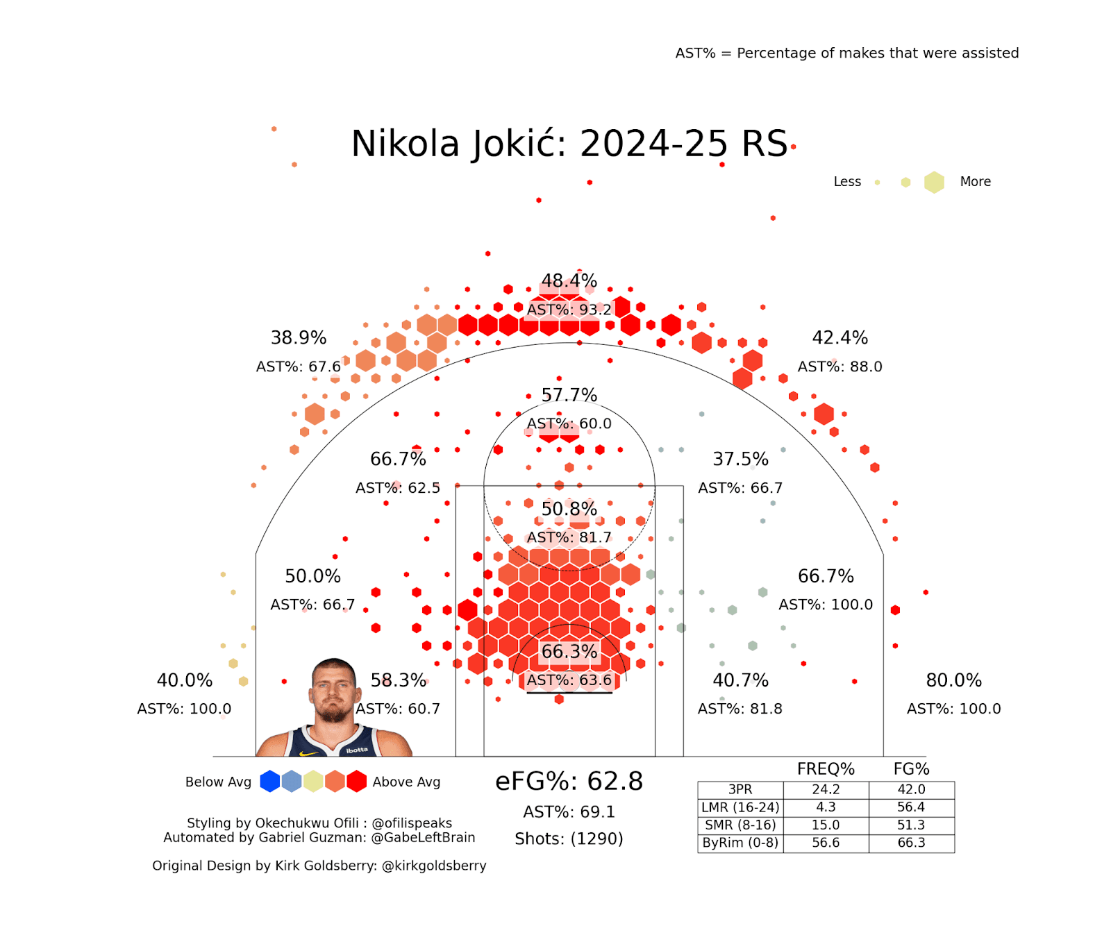 Whether he’s scoring with his back to the basket, off a screen, rolling after a pick, or isolating at the elbow, Jokic’s shot map shows how scrupulous and streamlined his onslaught really is: