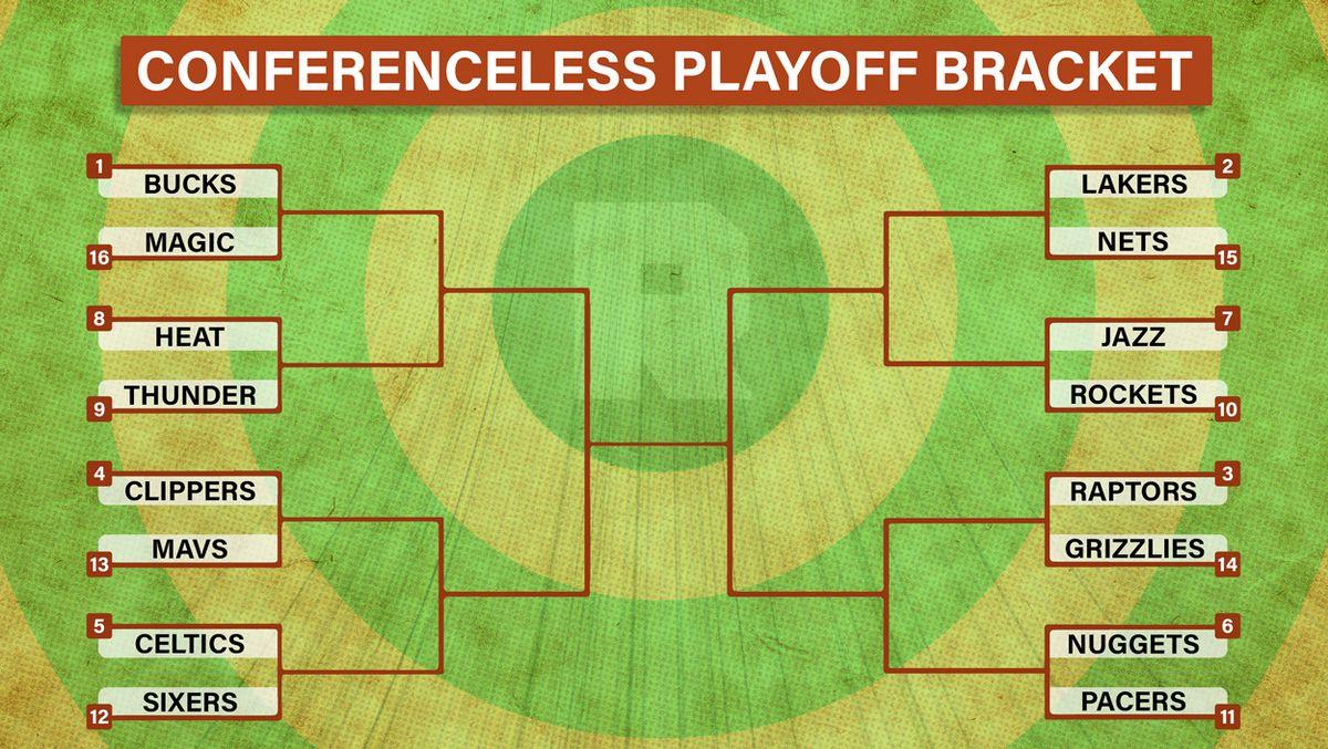 • Advance directly to the playoffs based on March 12 standings, without conferences: All the aforementioned concerns Eastern Conference teams have about conference imbalance apply to the conferenceless approach. Here’s how the bracket would look without conferences: