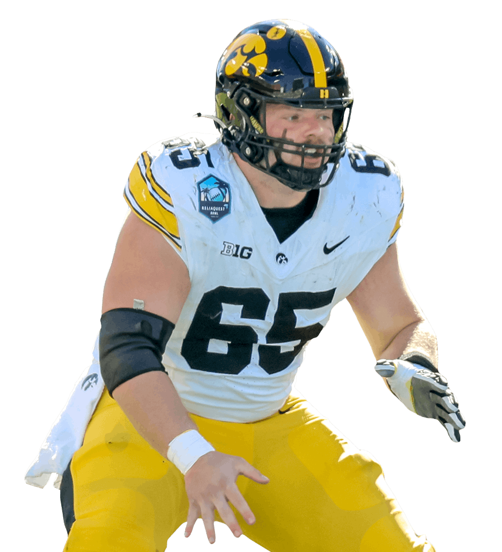 He can mirror and recover when he gets caught out of position and rewraps his hands when he starts to give ground to power rushers. He played in a run-heavy offense that runs a lot of play action, and he made a lot of calls at the line for the Iowa offense. He moved from defensive line to center in 2022 and started 50 games there for the Hawkeyes, earning All-America honors and winning the Rimington Trophy in 2025 as the nation’s best center.