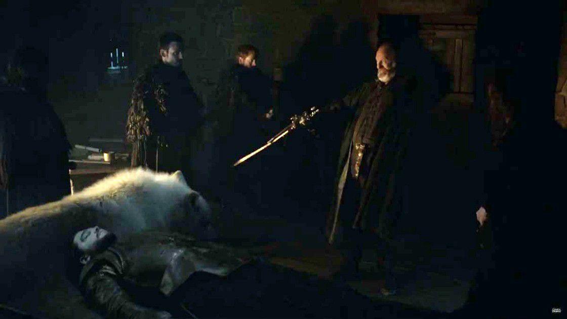 As many, many, many people have noted, there is ample precedent in the books to support the theory that Ghost acts as the backup hard drive for Jon’s postdeath consciousness. So far, so good. Now, in the segment of the trailer in question, Davos says, “I’ve never been much of a fighter,” and then, “Apologies for what you’re about to see.” We see Davos, flanked by several brothers of the Watch, in a small room. In the middle of the room is a table on which lies Jon Snow’s body (a-mouldering in the nave) and a motionless Ghost. Davos, I imagine, will need to leave that room, and Castle Black in general, with Jon’s body before the black brothers burn it. How does he accomplish this considering he’s “not much of a fighter” and he looks to be alone? Maybe with the help of a very large direwolf?