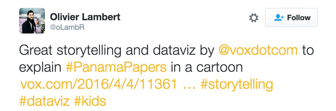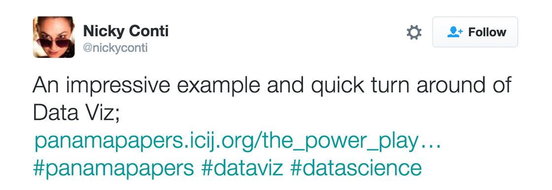 So, were the Panama Papers a win for data viz? Experts say … not really. “Most of the data visualizations and infographics that are found on the web are horribly designed … because most of the people who create them have never been trained in the graphical representation of quantitative data,” says data viz expert Stephen Few. He says The New York Times and National Geographic have invested in capable teams, but most other publications haven’t. For example, he says this data visualization isn’t great because it’s too difficult to read, can’t be filtered, and the “clients” the graphic refers to aren’t identified.