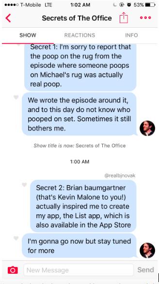 Knowing in my heart that B.J. approved, I changed my profile picture to a screenshot of his face. I changed my name and handle to “BJ Novak.” And then I started a “chat” called “Secrets of The Office.” Then I made up some secrets about The Office.