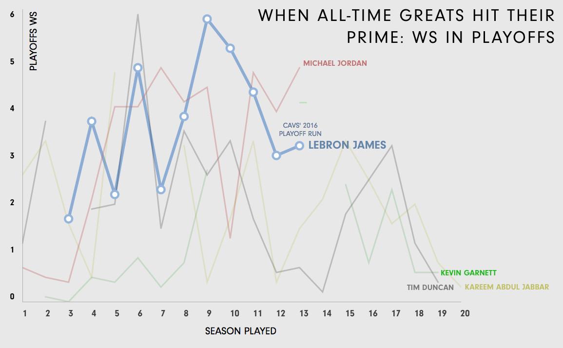 But we know that PER isn’t an all-encompassing stat. For further proof of LeBron’s astounding longevity, take a look at how his postseason win shares stack up against the aforementioned all-timers.