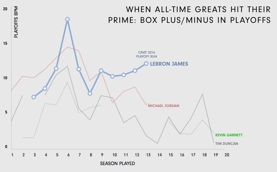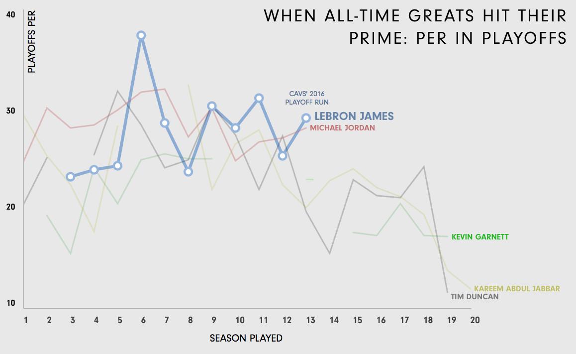 His postseason PER is hovering above 25 for the seventh time in eight years, and he shows no signs of slowing down. Though he’s 31, LeBron is still in his prime. The only question is: When will it end?