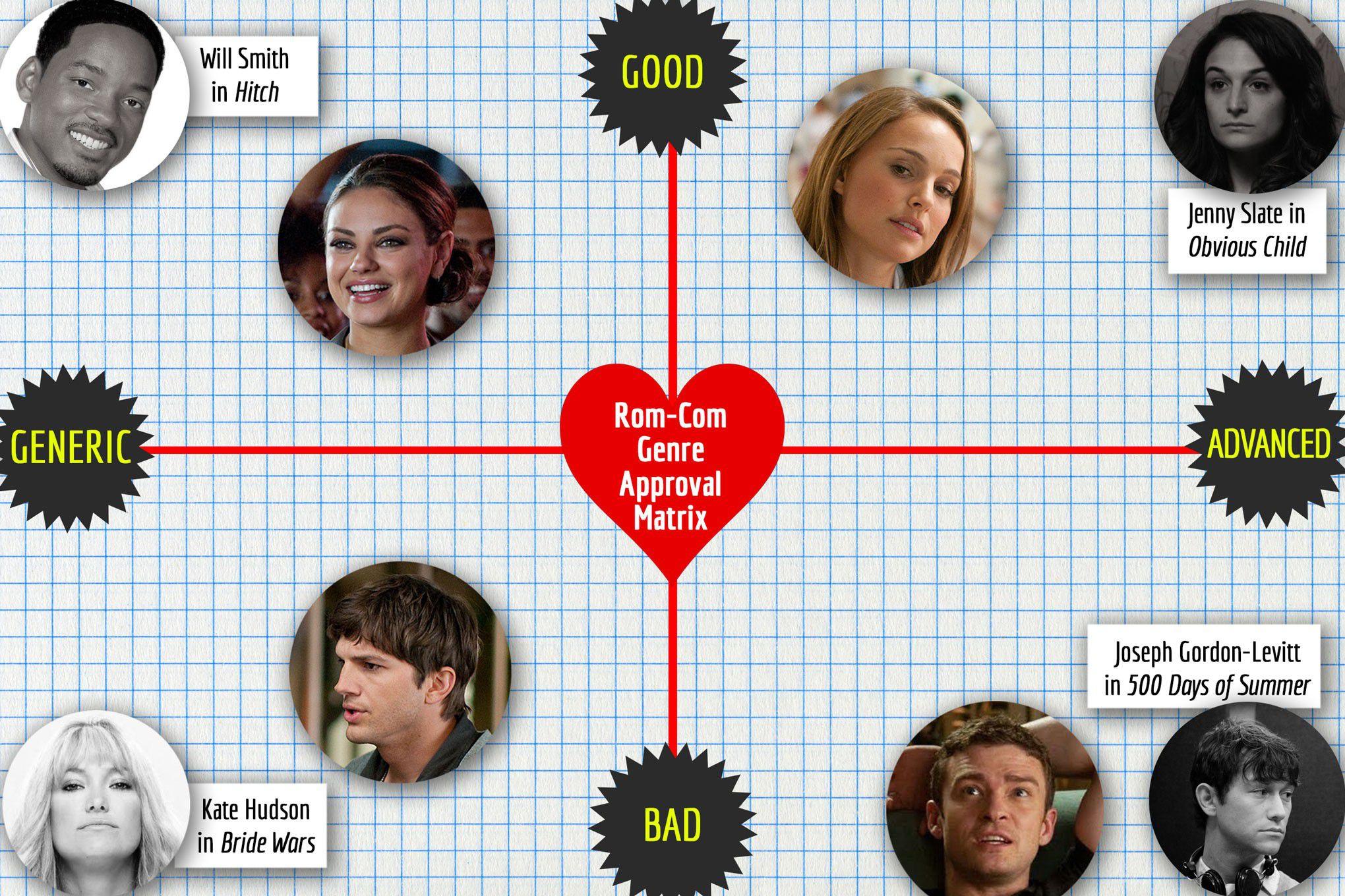 I like to think of lead rom-com performances from within the loose perspective of a genre-approval matrix. There is Generic Good: an actor who works between the lines of what we might consider “classical rom-com” and makes magic out of it. Think Will Smith in Hitch. There is Generic Bad: an actor who works between those same lines to his or her (and the film’s) detriment. Think Kate Hudson in Bride Wars. There is Advanced Good: an actor who pushes past rom-com convention toward something approaching transcendence. Think Jenny Slate in Obvious Child. And there is Advanced Bad: an actor who pushes past rom-com convention only to stray prohibitively from what the film has set out to achieve. Think Joseph Gordon-Levitt in 500 Days of Summer.