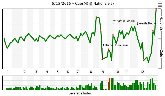 But late in the game, it got really wild. The Nats went up 2–1 in the bottom of the eighth, then the Cubs scored two in the top of the ninth before allowing the Nationals to tie it again. Then, the Cubs scored in the top of the 12th and looked to have it locked up — a peak win probability of 89.4 percent — before the Nationals came back and Jayson Werth eventually walked it off.