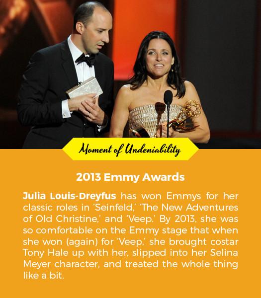 As she has amassed awards, Louis-Dreyfus has started to mess around with the form, and even her silly moments are borne of confidence and respect. (It’s a far cry from her backstage speechlessness — and crimped hair — in 1996.) In 2012, she and Amy Poehler did a bit where they “accidentally” exchanged acceptance speeches. In 2013, she brought Hale on stage with her to prompt her, the way the obsequious Walsh would help out Selina. “The second I won, the first thought that went through my head was, I’ve got to get up and do this bit,” she told the The Wall Street Journal. In 2014, she made out with Bryan Cranston. And in 2015, she got up and said, beaming: “I think it would be appropriate at this moment to quote our political satire, Veep: ‘What a great honor it must be for you to honor me tonight.’”