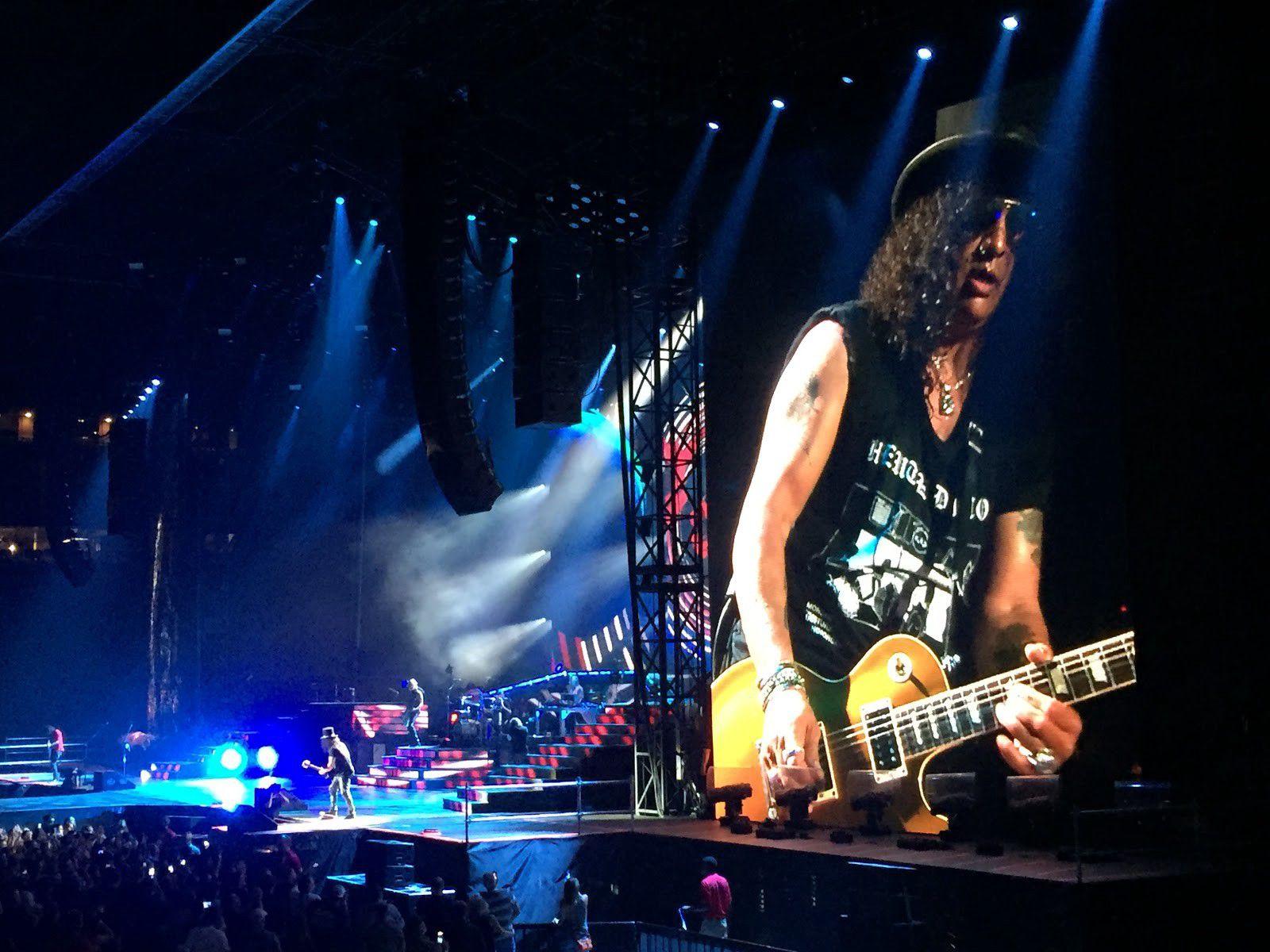 Be grateful, also, that the night had very few quieter moments, thanks mostly to Slash, visually singular lead-guitarist extraordinaire. Slash hath swelled also, though this was far less readily apparent, given that visual singularity. Meaning, the top hat, the sunglasses, the cascade of coal-black hair, the leather pants, the sweat pouring and the mouth slightly agape as he mimed along to another hostile and frantic and melodious and stealthily sentimental solo. He often held his guitar upright, as though he were very gently giving it the Heimlich maneuver — as though this were a Weekend at Bernie’s situation, and it was holding him up. Slash turned 50 last year, but he could pass for 30, or 90. It’s all a matter of how the light catches the sweat.