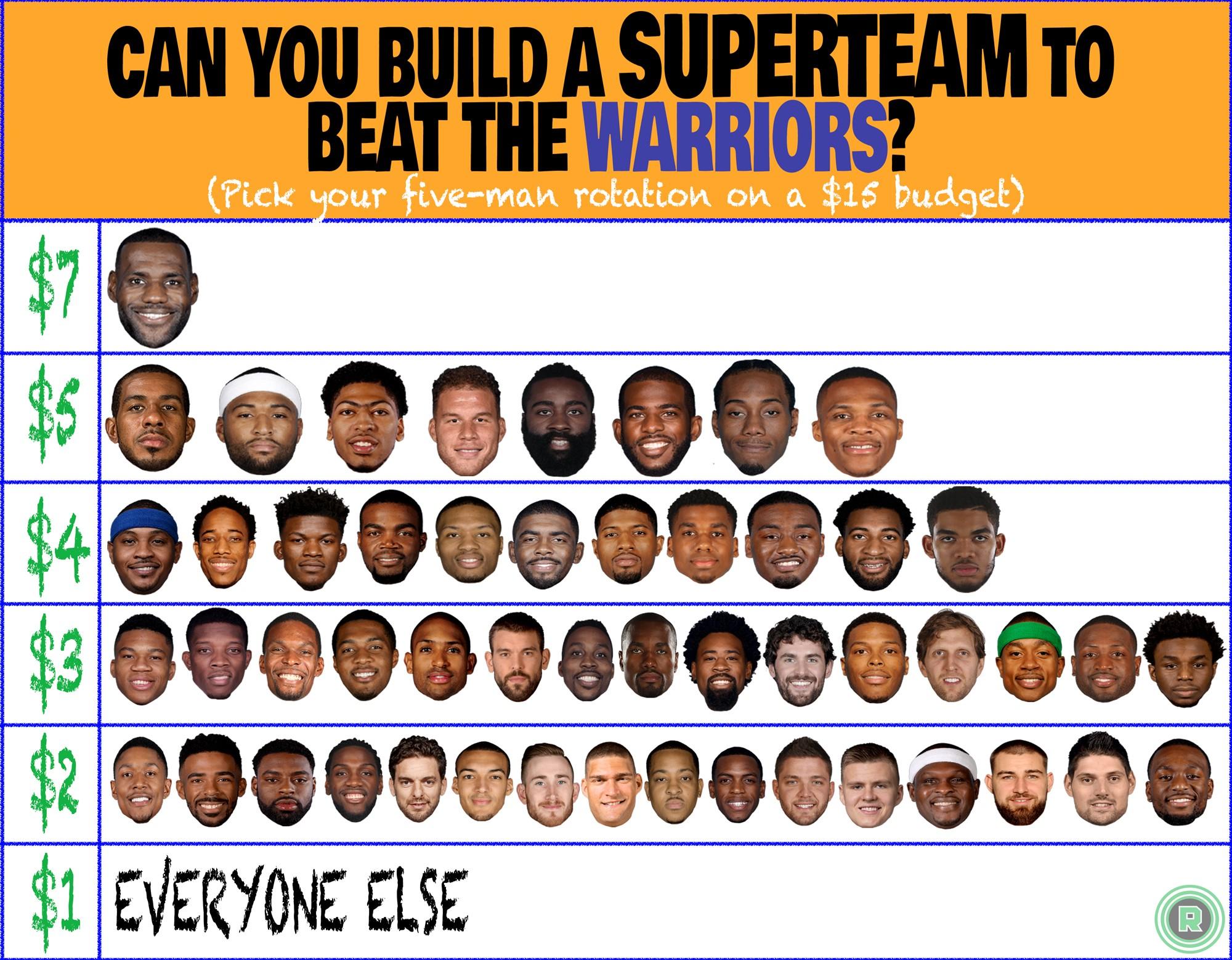 On Tuesday, we asked ourselves a question: Can you build a superteam to beat the Warriors? We assigned dollar values to players, and gave ourselves a $15 budget to pick a five-man rotation. We got a lot of great responses from readers who picked their own teams. Below are some of the best.