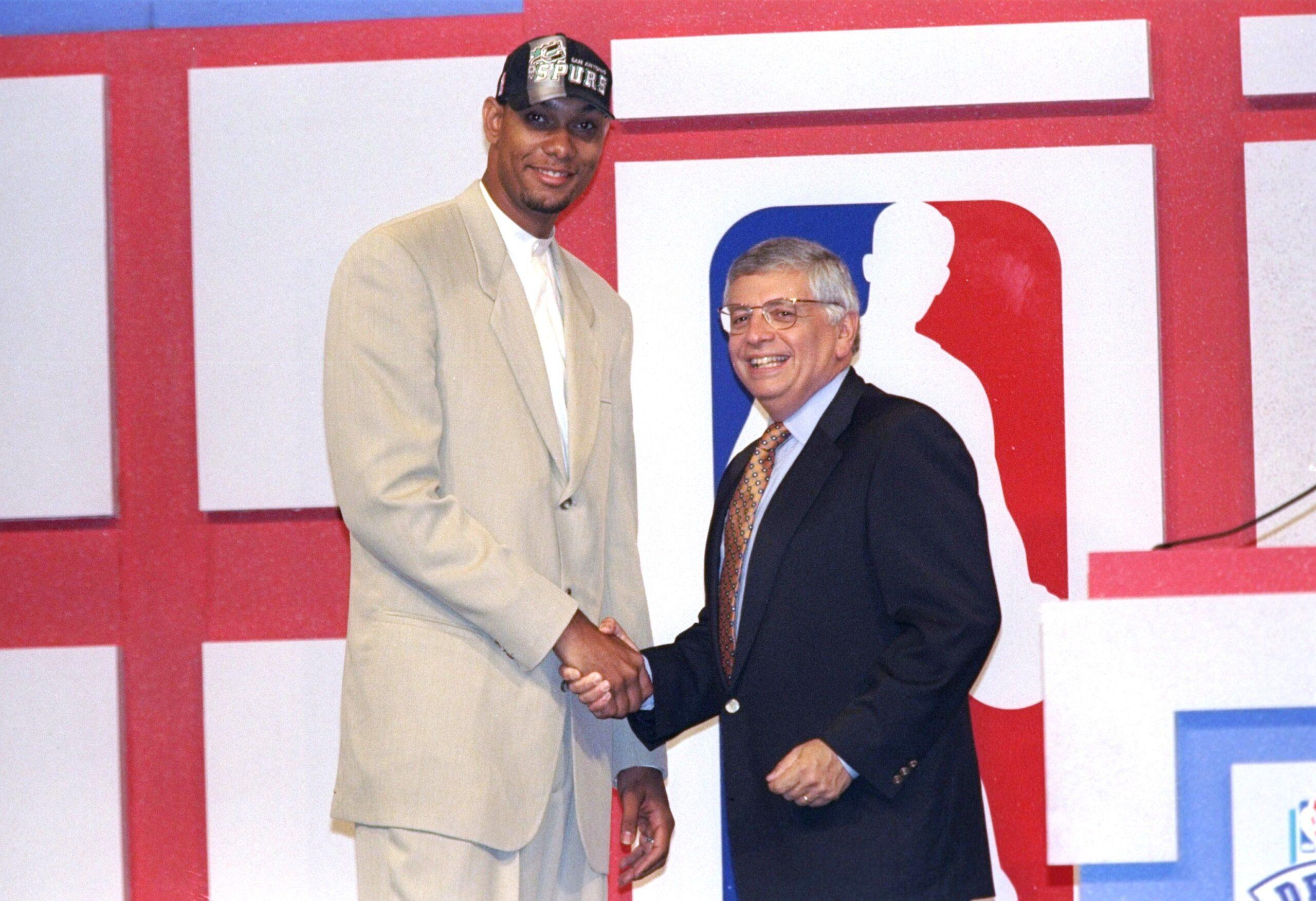 Beige Draft Suit: What’s funny is, I had never heard of Tim Duncan before the draft. Not a basketball fan. Which, of course, people are always joking with me about because I’m a size XXXXXXXXL suit with a 40-plus-inch inseam in the trousers, so people are like “Well, who did you think would wear you?” I like college football. Roll Tide. But that’s what they call irony, I guess. Hey, you know what’s ironic? Tim never ironing me. Not once. Anyway, draft night, 1997. Fun night. I remember this picture well.