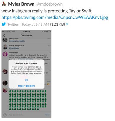 However, it seems that not all of those emoji bombs made it through. As journalist Myles Brown revealed in a tweeted screenshot Monday (the tweet has since been deleted but preserved in our Slack history), Instagram blocked at least one attempt to flood the comments with snakes with an alert that read: “Please rewrite your comment before posting it. We restrict certain content and actions to protect our community. Tell us if you think we made a mistake.”