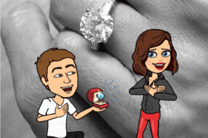 - How incredibly on brand! Not only does this look like a downloaded Snap, it features a filter, and a promo for Bitmoji, which Snapchat recently acquired and officially added to its app this week. Was the engagement planned for just such a moment? Perhaps just the announcement? Who can say!