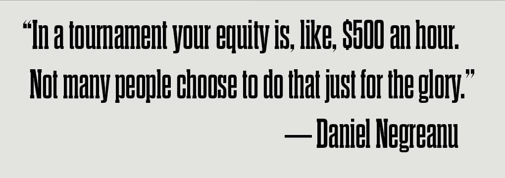 "In a tournament, you’re going to play for three days, and only if you win, if you get first, you’ll get $200,000, maybe $250,000," says Daniel Negreanu, two-time WSOP Player of the Year. "It’s just a bad business decision for some people who can make, for example, $8,000 an hour in a cash game. In a tournament your equity is, like, $500 an hour. Not many people choose to do that just for the glory."